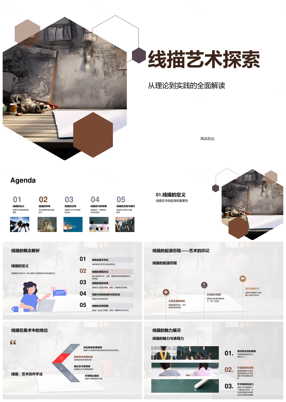 风云办公提供的线描艺术起源种类与素描本探索PPT模板,下载格式为pptx,一共28页,作品中文字及图均可以修改和编辑,图片更改请在作品中右键图片并更换,文字修改请直接点击文字进行修改。