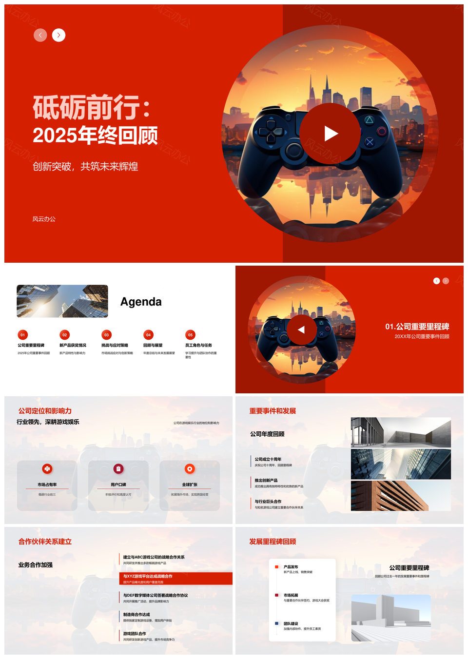 这是一张2025砥砺前行20XX游戏娱乐创新突破年终回顾PPT模板,包含2025、砥砺前行、20XX、游戏娱乐、创新突破、年终回顾等主题内容,也可用作2025砥砺前行游戏娱乐创新突破、砥砺前行20XX游戏娱乐创新突破、2025游戏娱乐创新突破年终回顾、20XX游戏娱乐创新突破年终回顾、2025游戏娱乐创新突破、20XX游戏娱乐创新突破、砥砺前行创新突破年终回顾、游戏娱乐创新突破年终回顾、2025砥砺前行年终回顾、20XX砥砺前行创新突破、砥砺前行游戏娱乐年终回顾、2025创新突破年终回顾、游戏娱乐创新突破、创新突破年终回顾、砥砺前行2025等PPT场景使用。 风云办公提供的2025砥砺前行20XX游戏娱乐创新突破年终回顾PPT模板,下载格式为pptx,一共28页,作品中文字及图均可以修改和编辑,图片更改请在作品中右键图片并更换,文字修改请直接点击文字进行修改。