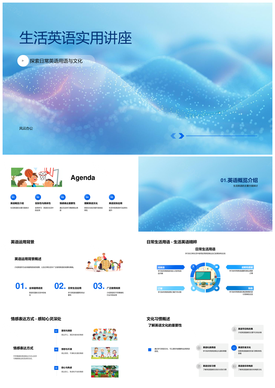 风云办公提供的生活英语实用交流文化情感应用讲座PPT模板,下载格式为pptx,一共33页,作品中文字及图均可以修改和编辑,图片更改请在作品中右键图片并更换,文字修改请直接点击文字进行修改。