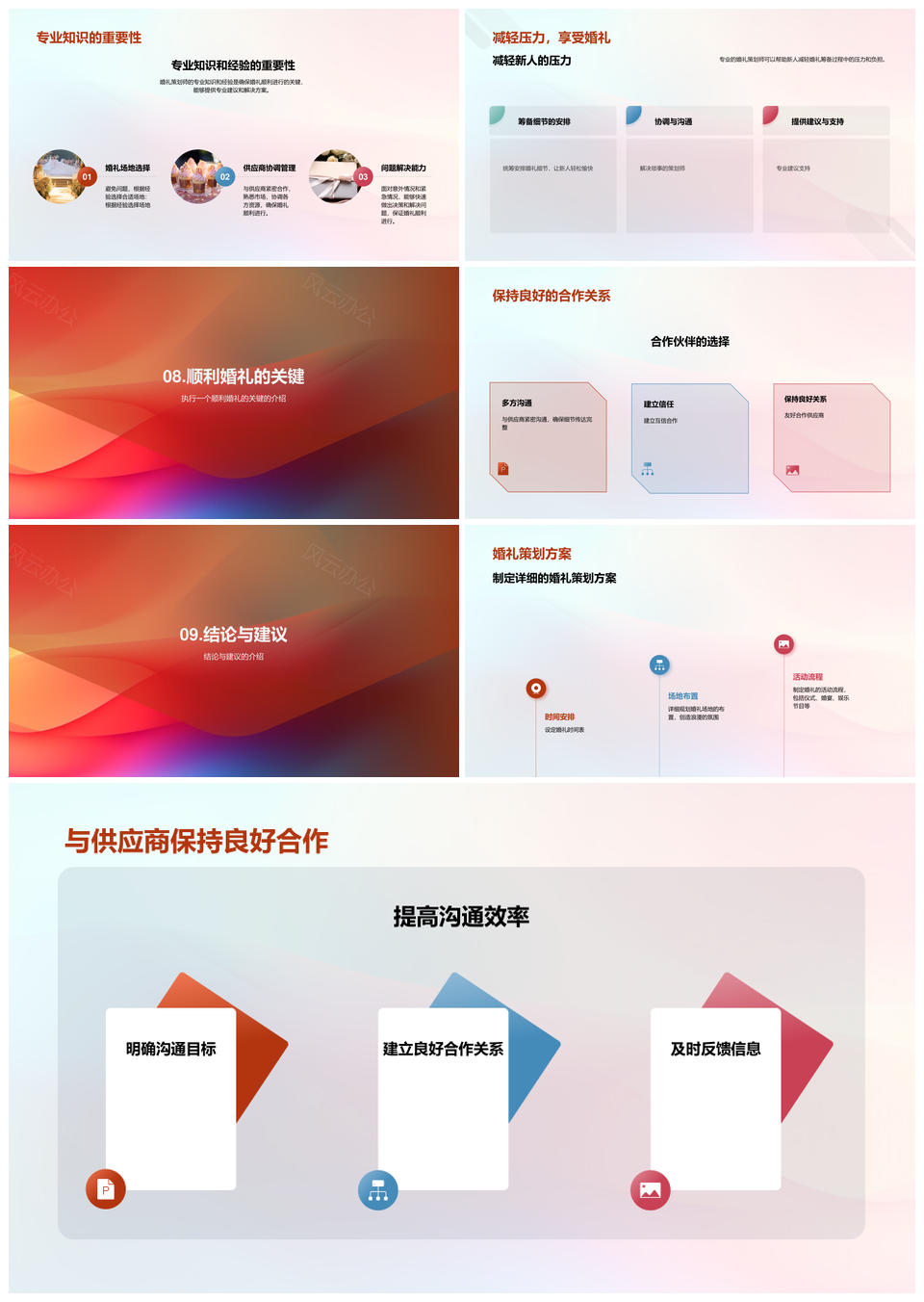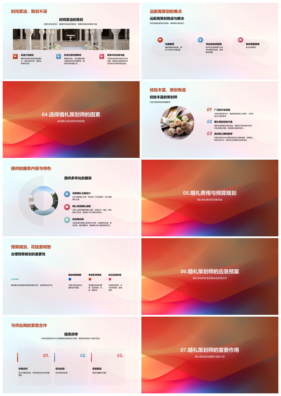 风云办公提供的婚礼策划执行方案流程PPT模板,下载格式为pptx,一共25页,作品中文字及图均可以修改和编辑,图片更改请在作品中右键图片并更换,文字修改请直接点击文字进行修改。