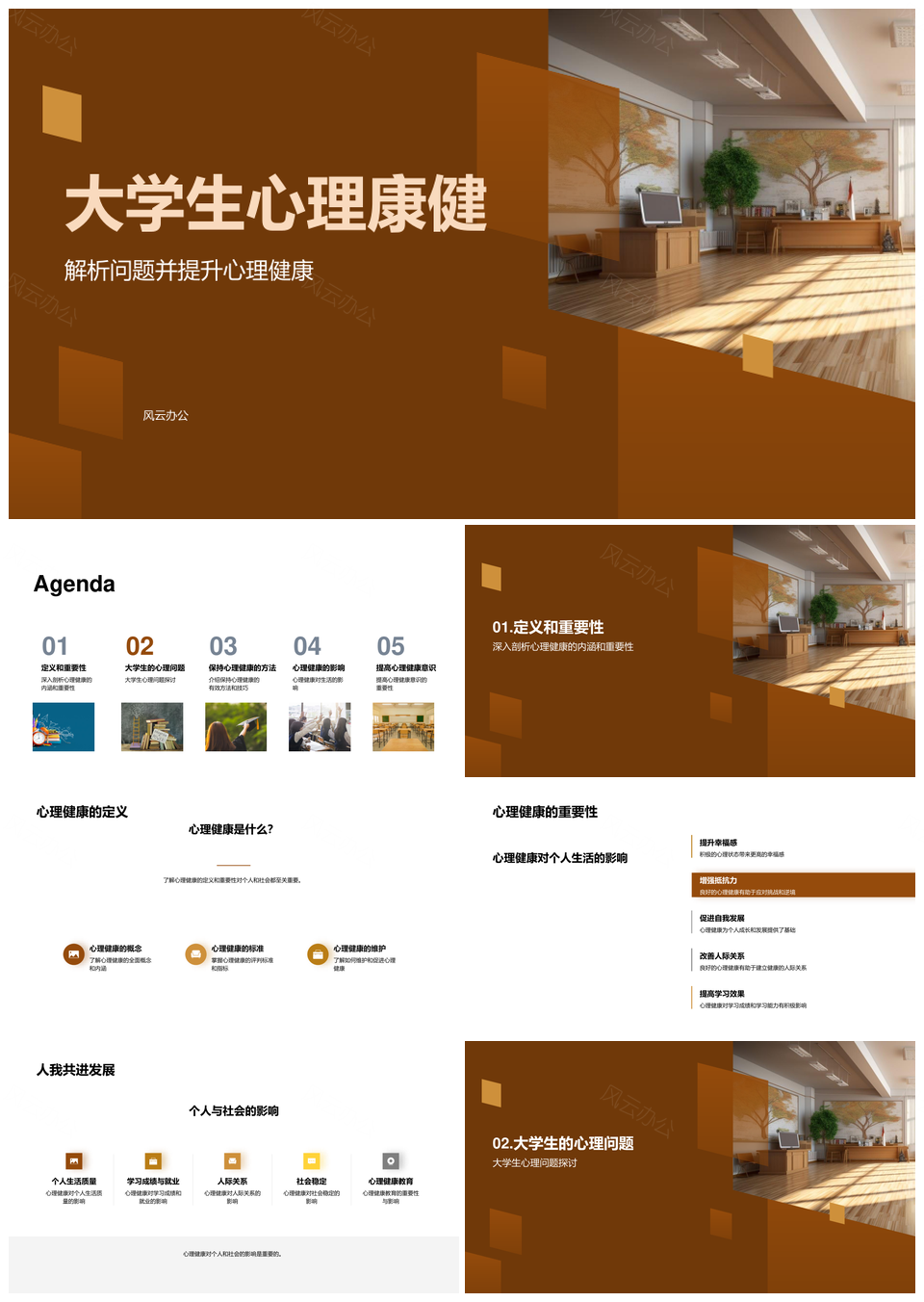 风云办公提供的大学生心理健康压力调适与校园应对PPT模板,下载格式为pptx,一共25页,作品中文字及图均可以修改和编辑,图片更改请在作品中右键图片并更换,文字修改请直接点击文字进行修改。