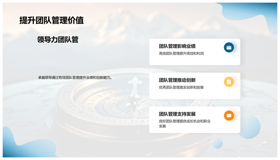 这是一张旅游团队卓越领导力协作管理提升PPT模板,包含旅游团队、卓越领导力、协作管理、提升等主题内容,也可用作旅游团队卓越领导力、团队卓越领导力协作、卓越领导力协作管理、领导力协作管理提升、旅游团队卓越协作管理、团队领导力协作管理、卓越领导力管理提升、旅游团队管理提升、协作管理提升卓越、卓越协作管理提升、旅游团队卓越提升、团队协作管理提升、领导力协作提升、卓越领导力协作提升、协作管理领导力等PPT场景使用。