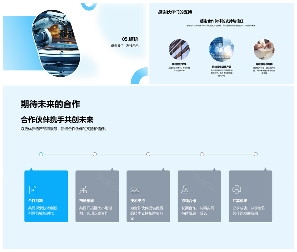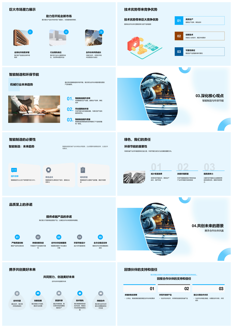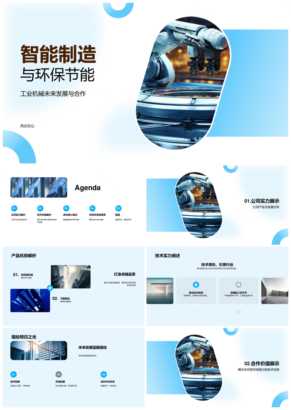 风云办公提供的智能制造环保节能机械臂技术实力蓝图PPT模板,下载格式为pptx,一共21页,作品中文字及图均可以修改和编辑,图片更改请在作品中右键图片并更换,文字修改请直接点击文字进行修改。