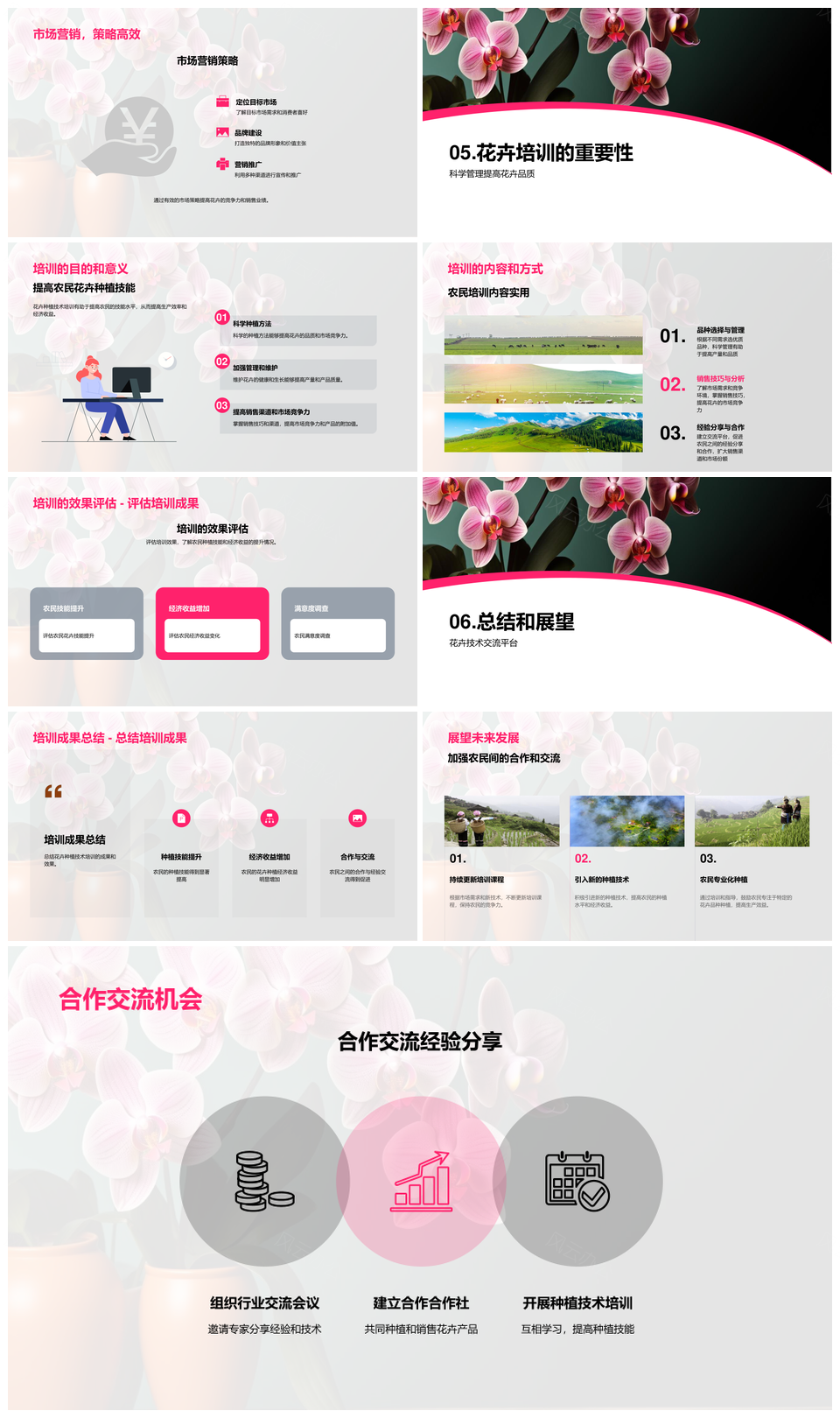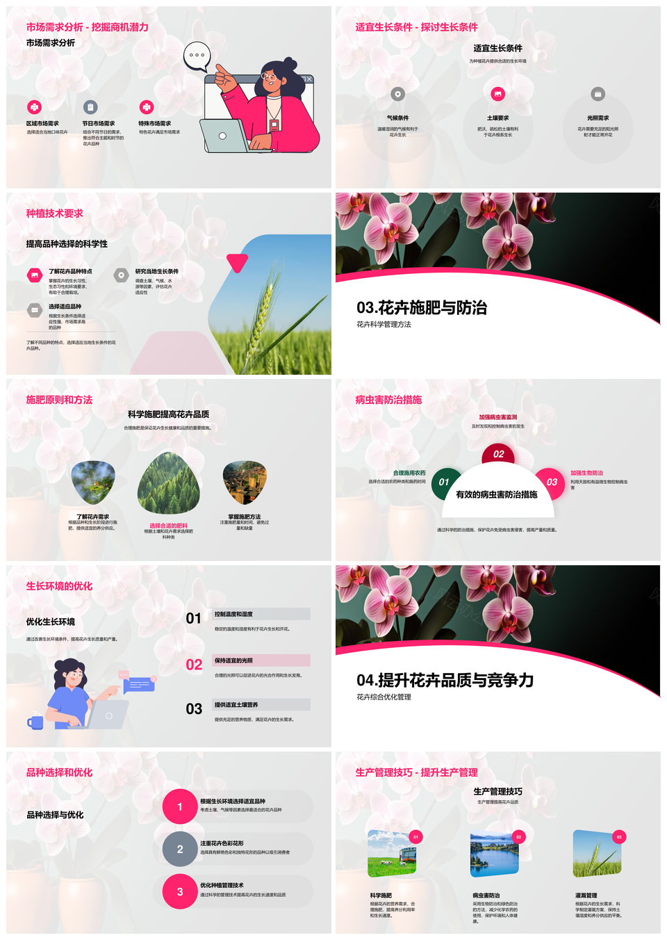 这是一张花卉种植技术助农产销增收PPT模板,包含花卉种植技术、助农、产销、增收等主题内容,也可用作花卉种植技术助农、种植技术助农产销、技术助农产销增收、助农产销增收、花卉种植技术、种植技术助农、技术助农产销、助农产销、产销增收、花卉种植、种植技术、技术助农、花卉助农、技术增收、种植产销等PPT场景使用。 风云办公提供的花卉种植技术助农产销增收PPT模板,下载格式为pptx,一共27页,作品中文字及图均可以修改和编辑,图片更改请在作品中右键图片并更换,文字修改请直接点击文字进行修改。
