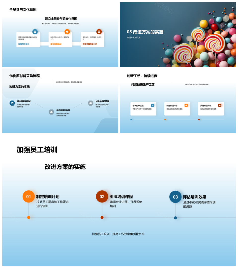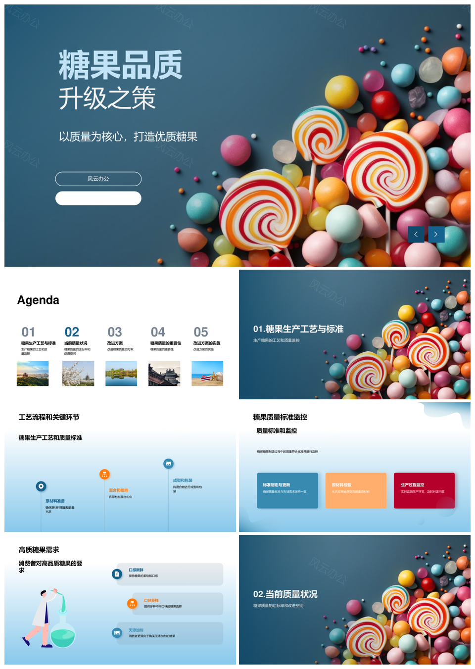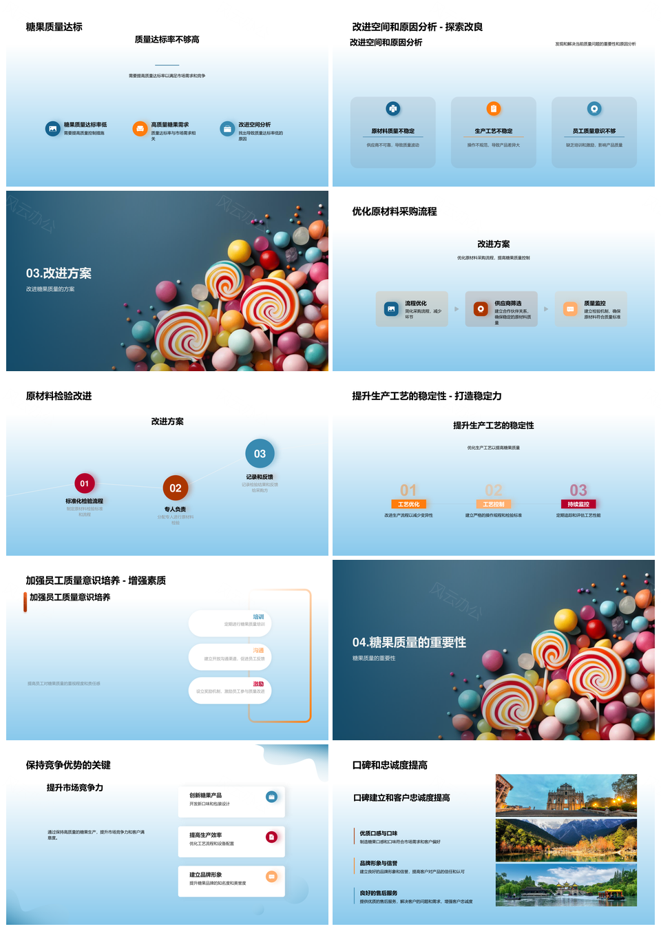 风云办公提供的糖果生产关键环节优化与质量监控方案PPT模板,下载格式为pptx,一共23页,作品中文字及图均可以修改和编辑,图片更改请在作品中右键图片并更换,文字修改请直接点击文字进行修改。