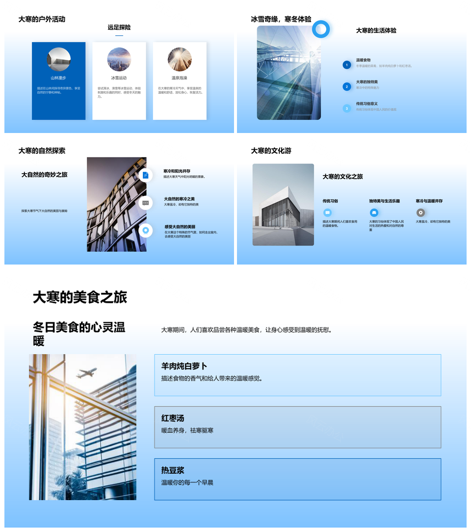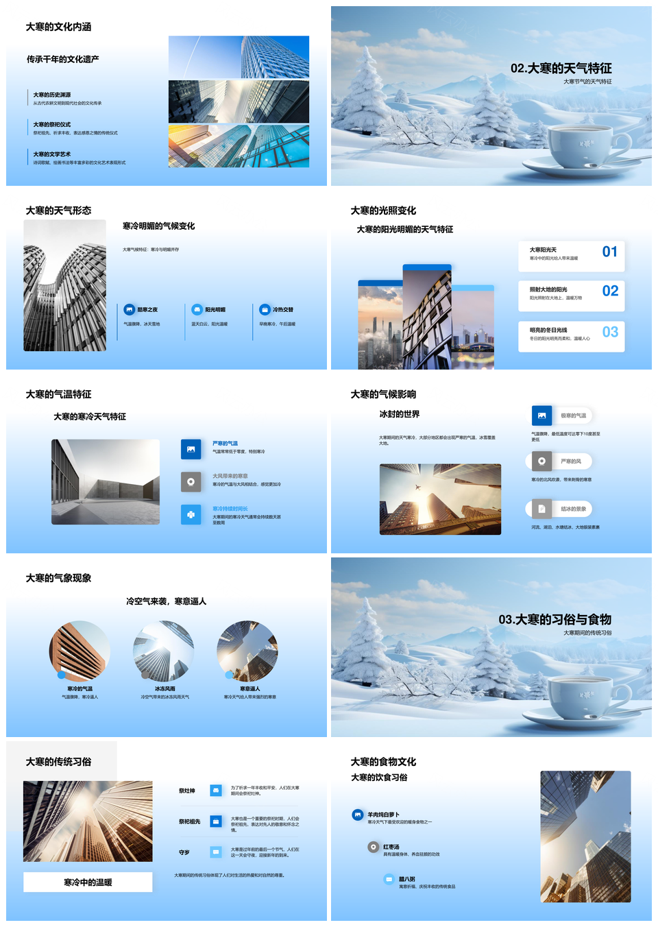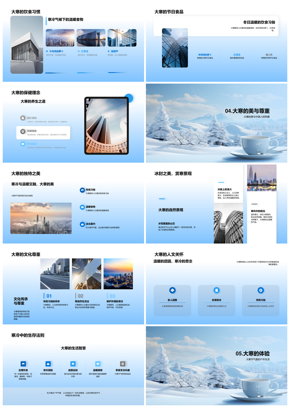 这是一张大寒节气寒暖交织传统习俗雪景暖食文化自然PPT模板,包含大寒节气、寒暖交织、传统习俗、雪景、暖食文化、自然等主题内容,也可用作大寒节气寒暖交织雪景、传统习俗雪景暖食文化、雪景暖食文化自然、大寒节气寒暖交织、大寒节气传统习俗、寒暖交织传统习俗雪景、传统习俗雪景暖食、雪景暖食文化、暖食文化自然、寒暖交织雪景自然、大寒节气、寒暖交织、传统习俗、雪景暖食、暖食文化等PPT场景使用。 风云办公提供的大寒节气寒暖交织传统习俗雪景暖食文化自然PPT模板,下载格式为pptx,一共33页,作品中文字及图均可以修改和编辑,图片更改请在作品中右键图片并更换,文字修改请直接点击文字进行修改。
