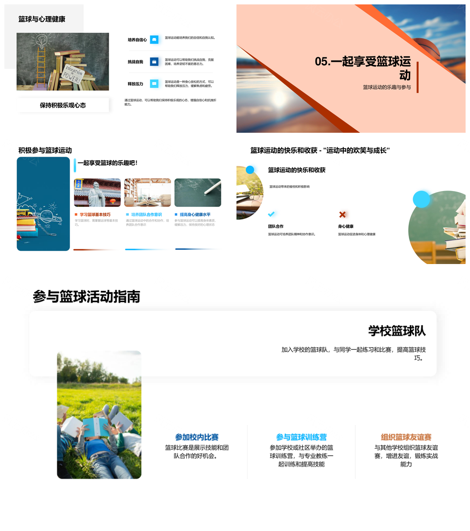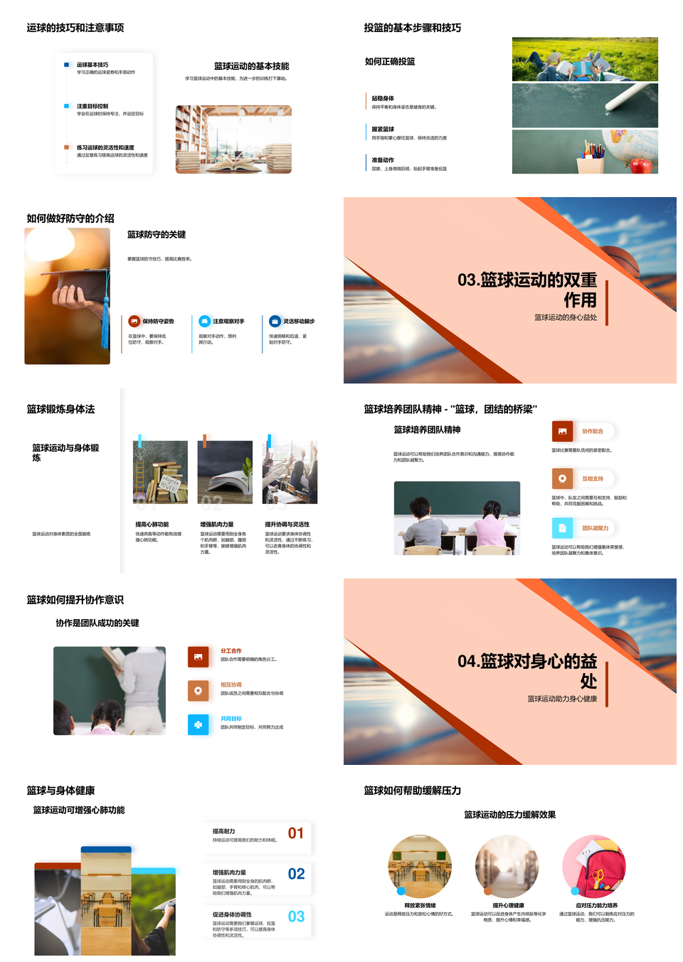 这是一张篮球起源发展运球投篮防守锻炼身心健康PPT模板,包含篮球、起源、发展、运球、投篮、防守、锻炼、身心健康等主题内容,也可用作篮球运球投篮防守、运球投篮防守锻炼、投篮防守锻炼身心、防守锻炼身心健康、篮球起源发展运球、起源发展运球投篮、发展运球投篮防守、运球投篮防守锻炼、运球投篮锻炼身心、投篮防守锻炼健康、起源发展锻炼身心、发展运球锻炼健康、防守锻炼身心健康、篮球锻炼身心健康、运球投篮防守锻炼等PPT场景使用。 风云办公提供的篮球起源发展运球投篮防守锻炼身心健康PPT模板,下载格式为pptx,一共23页,作品中文字及图均可以修改和编辑,图片更改请在作品中右键图片并更换,文字修改请直接点击文字进行修改。