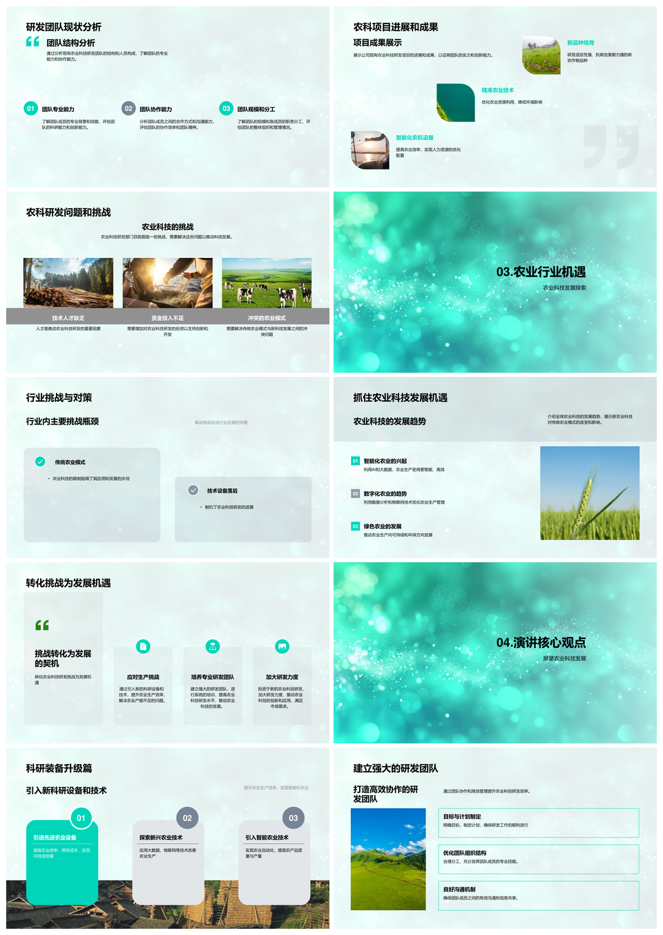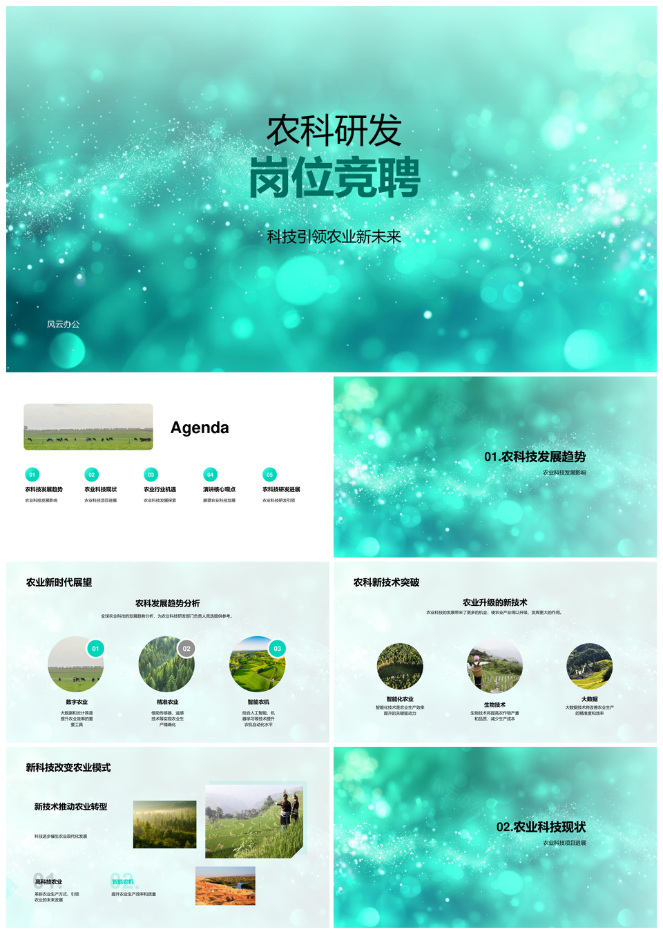 风云办公提供的农业科技研发竞聘趋势团队机遇PPT模板,下载格式为pptx,一共23页,作品中文字及图均可以修改和编辑,图片更改请在作品中右键图片并更换,文字修改请直接点击文字进行修改。