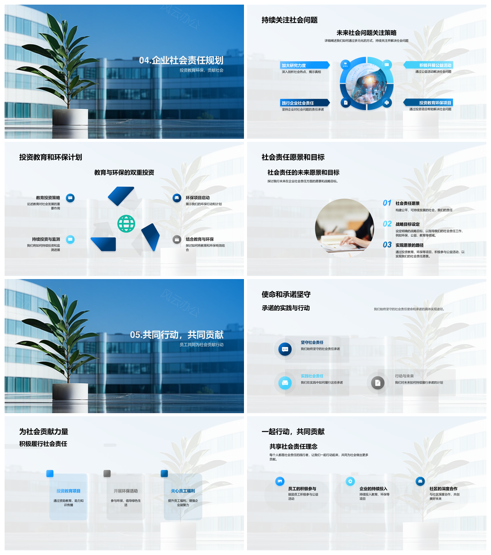 这是一张企业社会责任实践公益环保员工教育关怀行动PPT模板,包含企业社会责任、实践、公益、环保、员工、教育、关怀、行动等主题内容,也可用作企业社会责任实践公益、社会责任实践公益环保、实践公益环保员工教育、公益环保员工教育关怀、环保员工教育关怀行动、企业社会责任实践、社会责任实践公益、实践公益环保、公益环保员工教育、环保员工教育关怀、员工教育关怀行动、企业社会责任、社会责任公益环保、实践公益员工教育、公益环保关怀行动等PPT场景使用。 风云办公提供的企业社会责任实践公益环保员工教育关怀行动PPT模板,下载格式为pptx,一共26页,作品中文字及图均可以修改和编辑,图片更改请在作品中右键图片并更换,文字修改请直接点击文字进行修改。