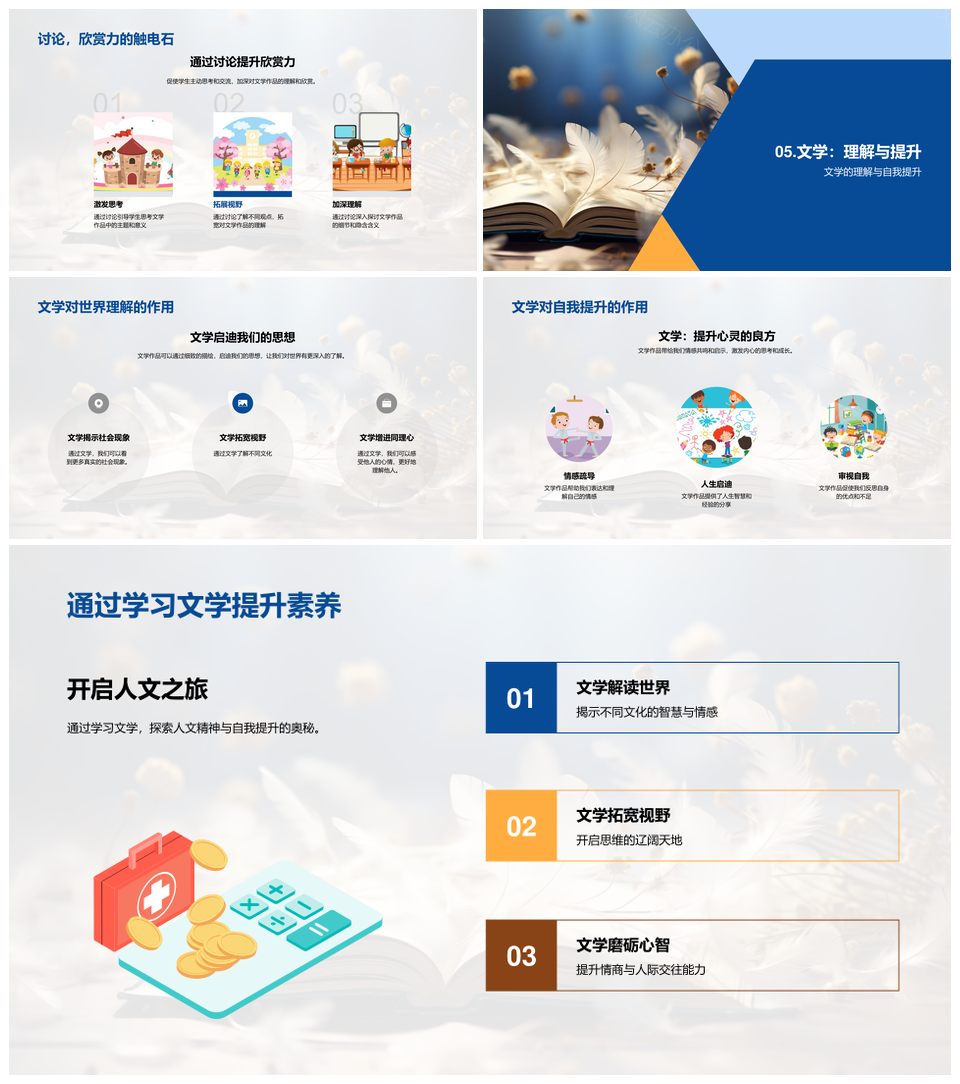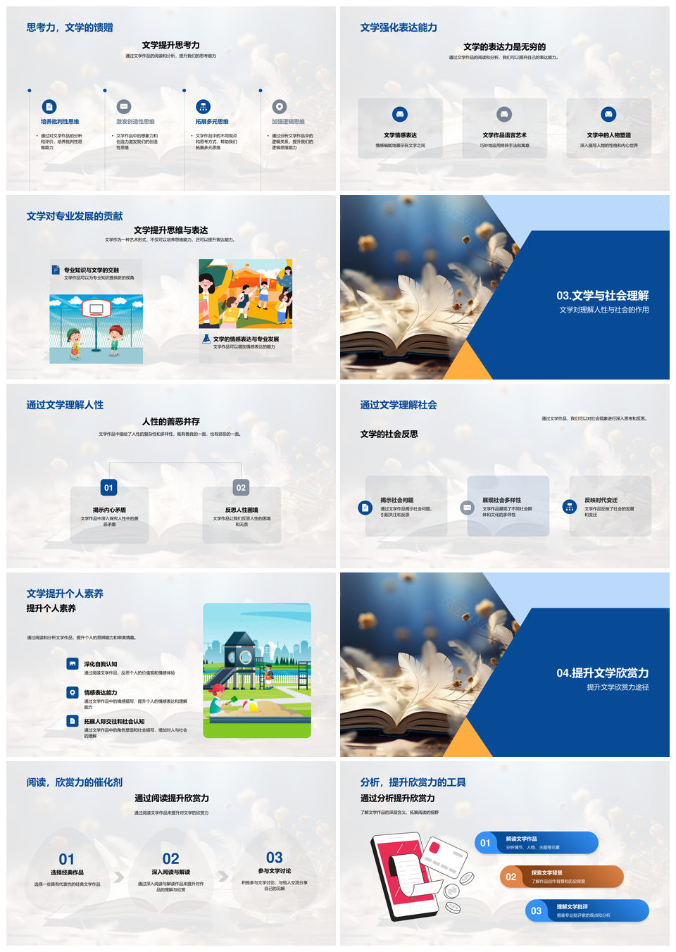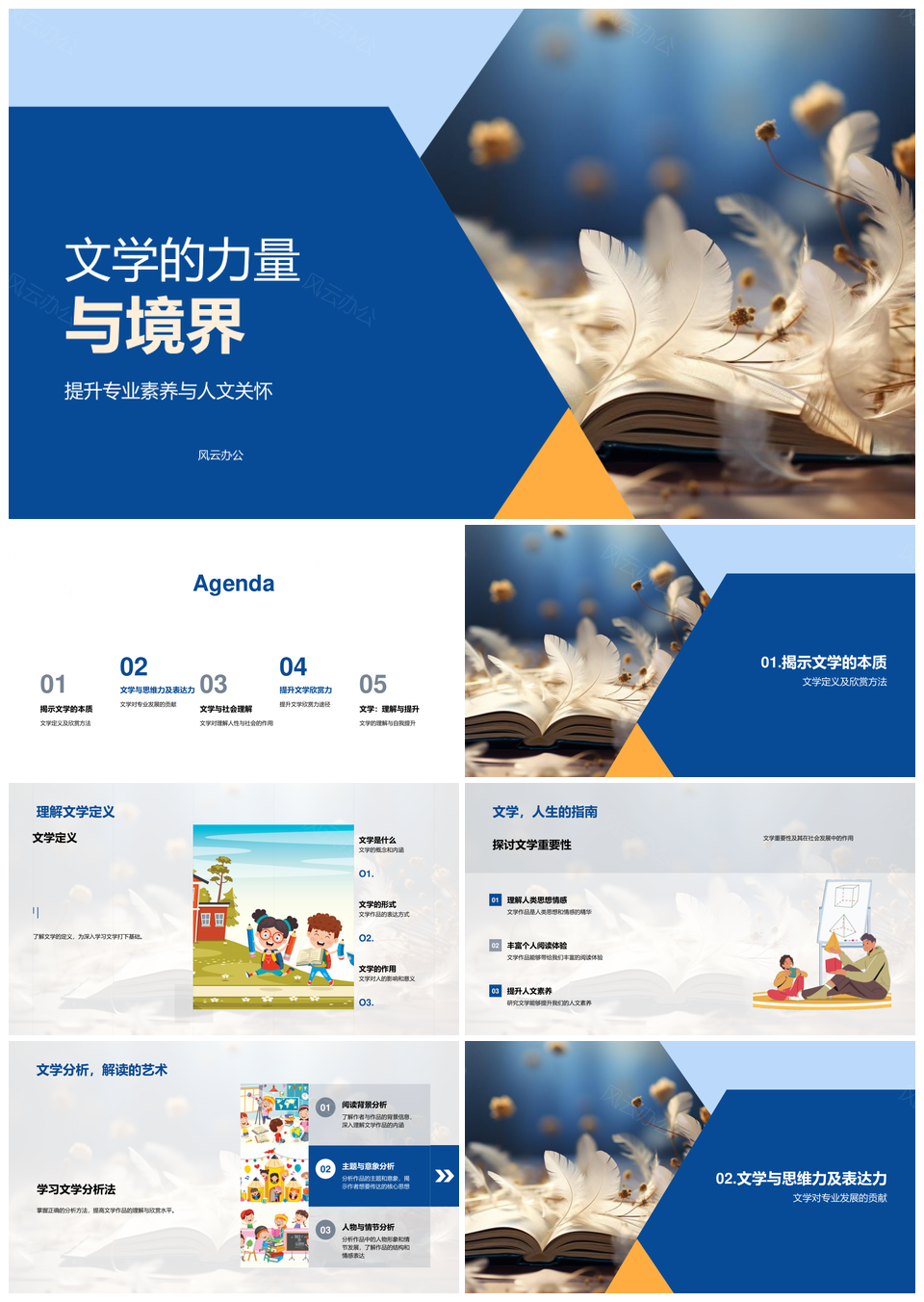 风云办公提供的文学力量境界与专业人文素养思考表达PPT模板,下载格式为pptx,一共23页,作品中文字及图均可以修改和编辑,图片更改请在作品中右键图片并更换,文字修改请直接点击文字进行修改。