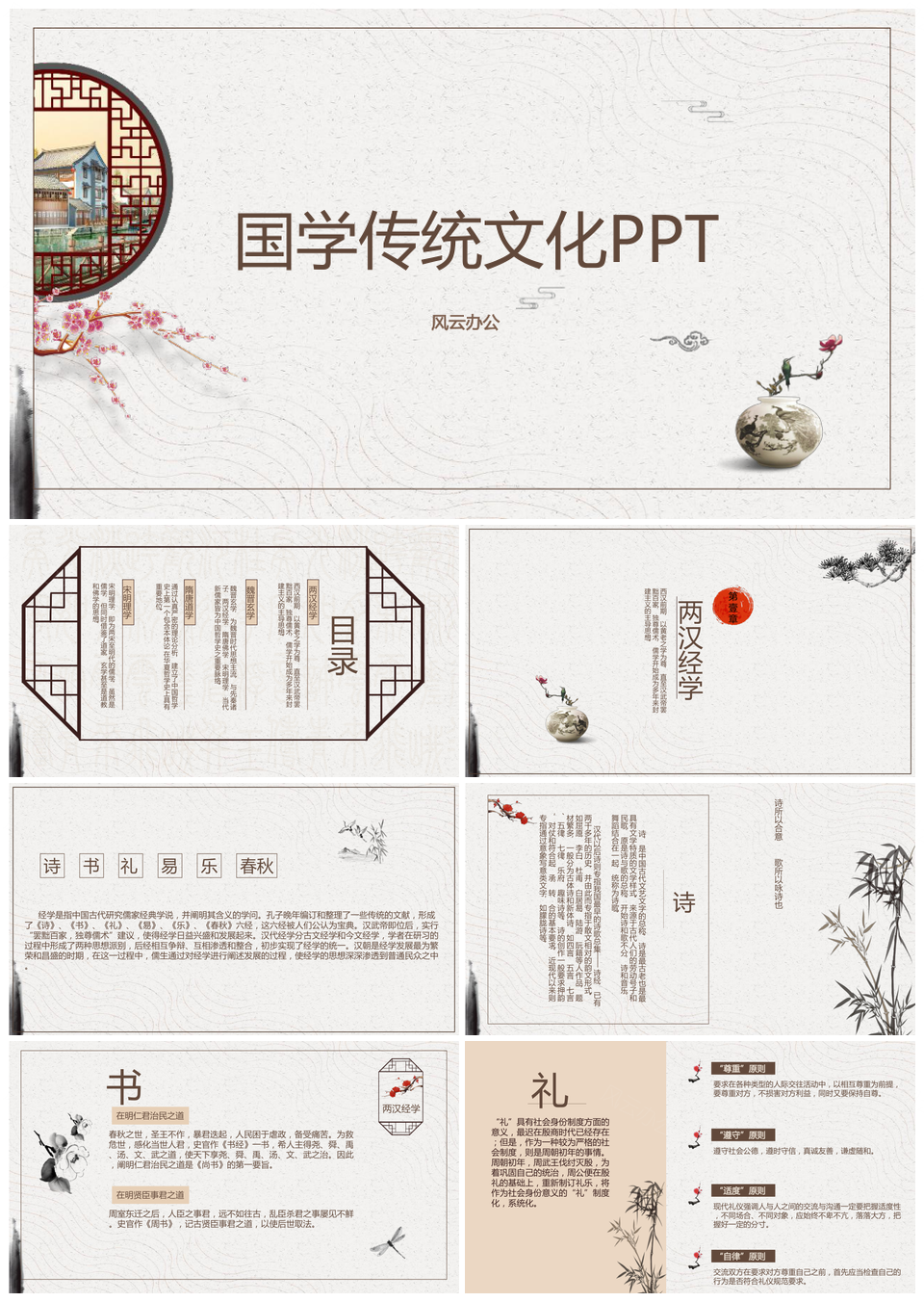 这是一张国学传统文化PPT模板,包含国学、传统文化等主题内容,也可用作国学、传统、文化 国学传统文化、国学传统、传统文化、国学文化、传统国学等PPT场景使用。 风云办公提供的国学传统文化PPT模板,下载格式为pptx,一共21页,作品中文字及图均可以修改和编辑,图片更改请在作品中右键图片并更换,文字修改请直接点击文字进行修改。