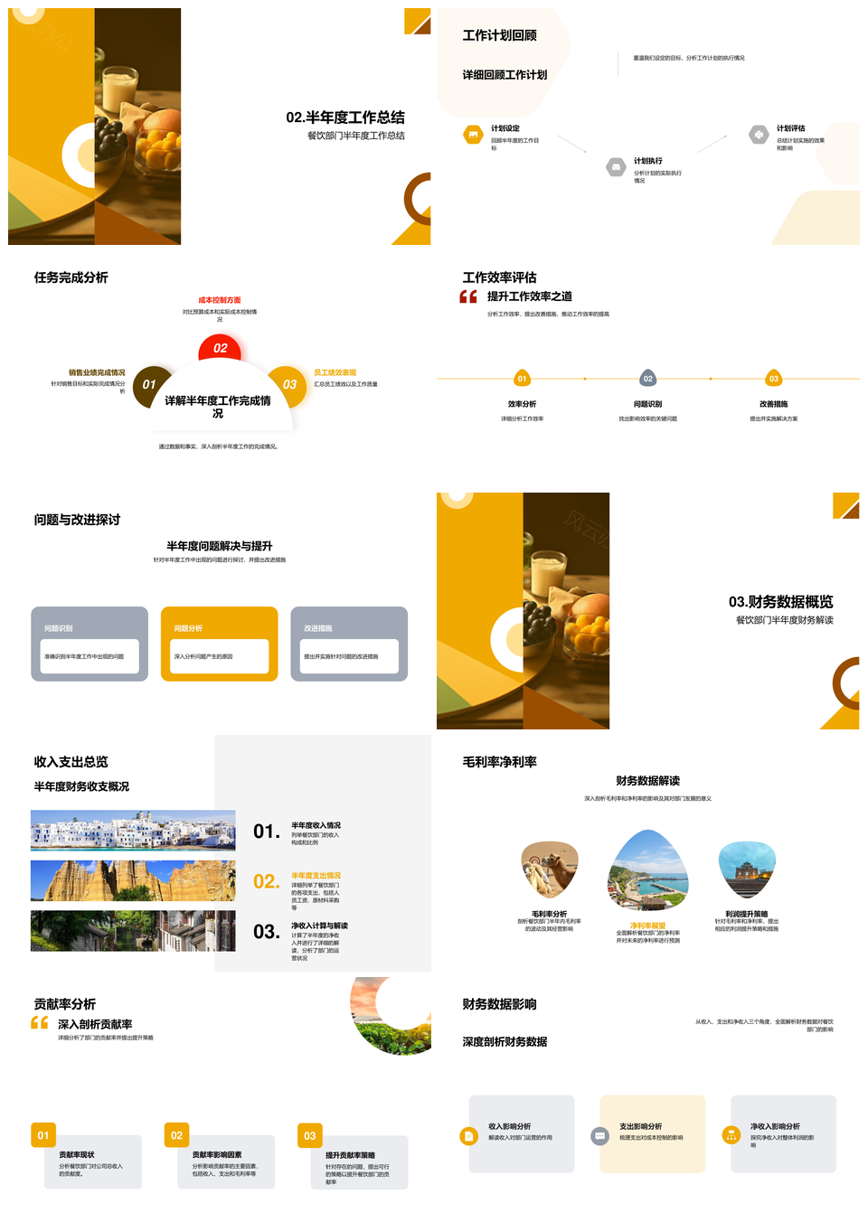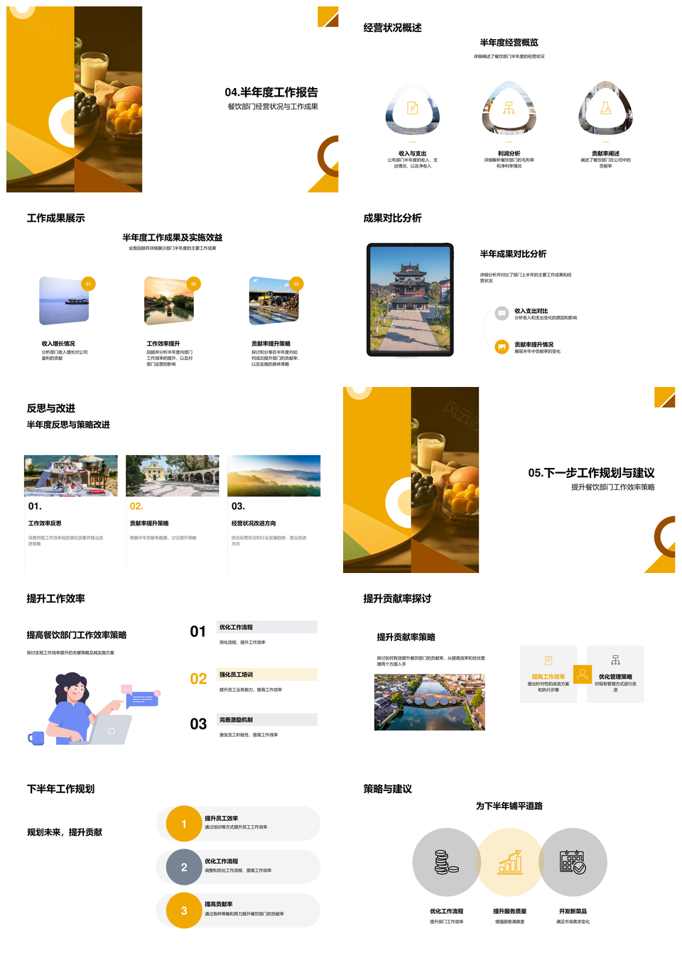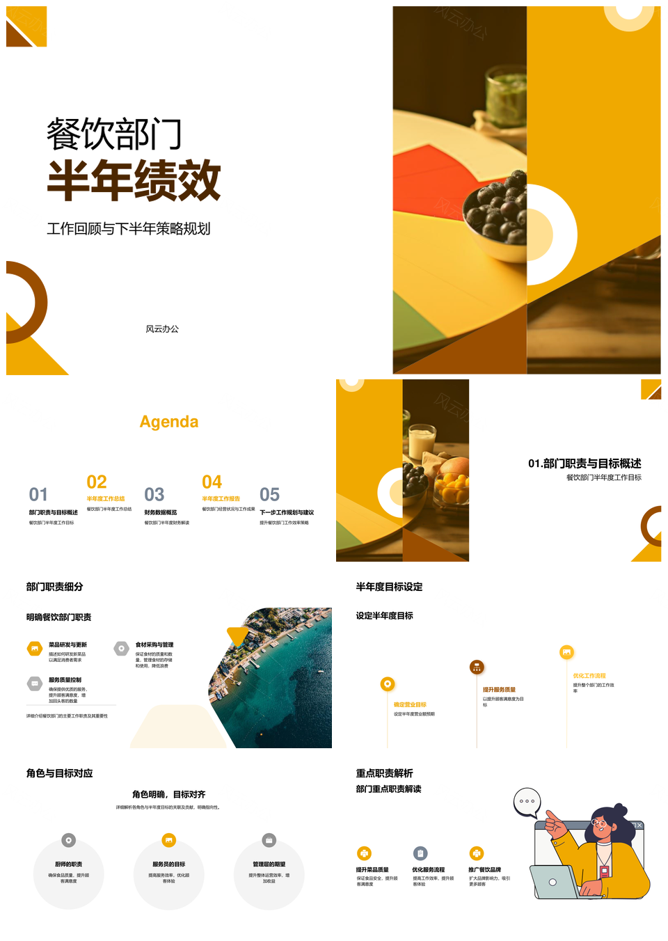 这是一张餐饮部门年中总结半年度绩效回顾策略规划PPT模板,包含餐饮部门、年中总结、半年度、绩效回顾、策略规划等主题内容,也可用作餐饮部门年中总结、年中总结半年度绩效、半年度绩效回顾策略、绩效回顾策略规划、部门半年度绩效回顾、餐饮部门半年度绩效、部门年中总结、总结半年度绩效、半年度绩效回顾、绩效回顾策略、部门半年度绩效、年中绩效回顾、餐饮策略规划、半年度策略规划、年中总结等PPT场景使用。 风云办公提供的餐饮部门年中总结半年度绩效回顾策略规划PPT模板,下载格式为pptx,一共28页,作品中文字及图均可以修改和编辑,图片更改请在作品中右键图片并更换,文字修改请直接点击文字进行修改。