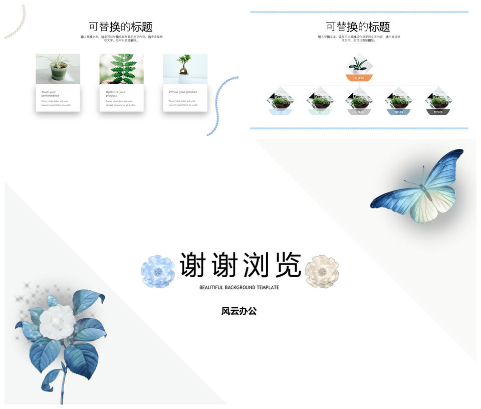 唯美蓝色小清新简约花鸟年终总结PPT模板