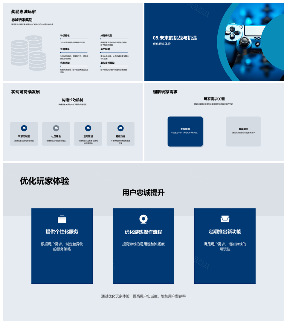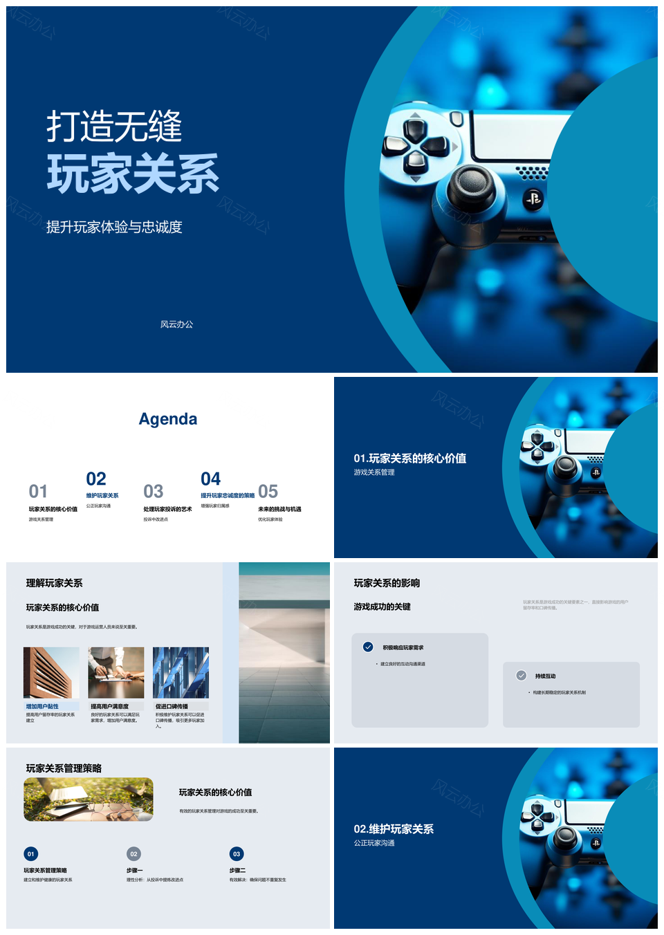 风云办公提供的游戏运营玩家关系管理提升忠诚体验PPT模板,下载格式为pptx,一共23页,作品中文字及图均可以修改和编辑,图片更改请在作品中右键图片并更换,文字修改请直接点击文字进行修改。