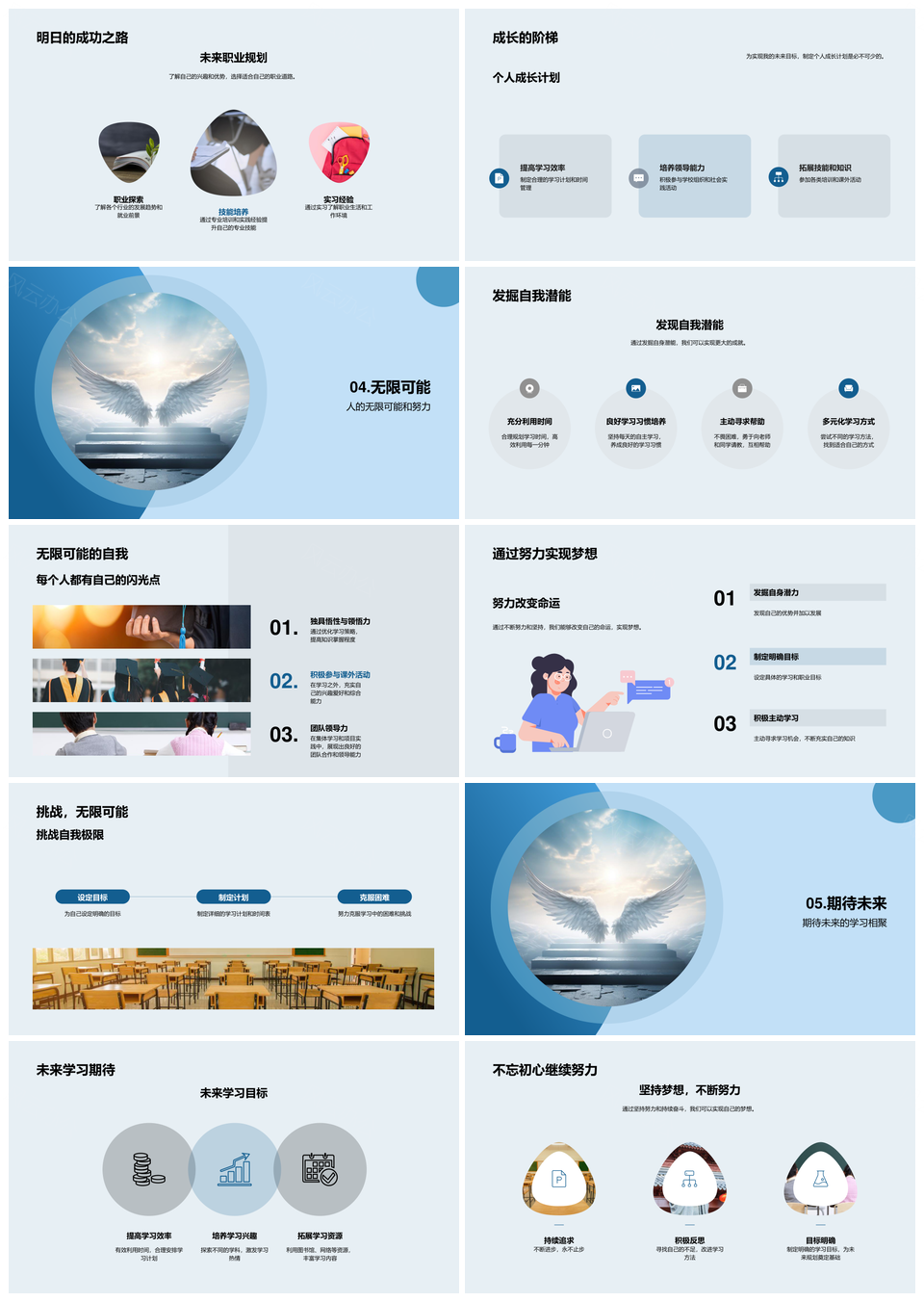 这是一张梦想之翼学期规划提升学习互动未来无限PPT模板,包含梦想之翼、学期规划、提升、学习、互动、未来无限等主题内容,也可用作梦想之翼学期规划提升学习、学期规划提升学习互动、提升学习互动未来无限、学期规划提升学习、提升学习互动未来、学习互动未来无限、学期规划提升、规划提升学习、提升学习互动、学习互动未来、学期规划、规划提升、提升学习、学习互动、互动未来等PPT场景使用。 风云办公提供的梦想之翼学期规划提升学习互动未来无限PPT模板,下载格式为pptx,一共30页,作品中文字及图均可以修改和编辑,图片更改请在作品中右键图片并更换,文字修改请直接点击文字进行修改。