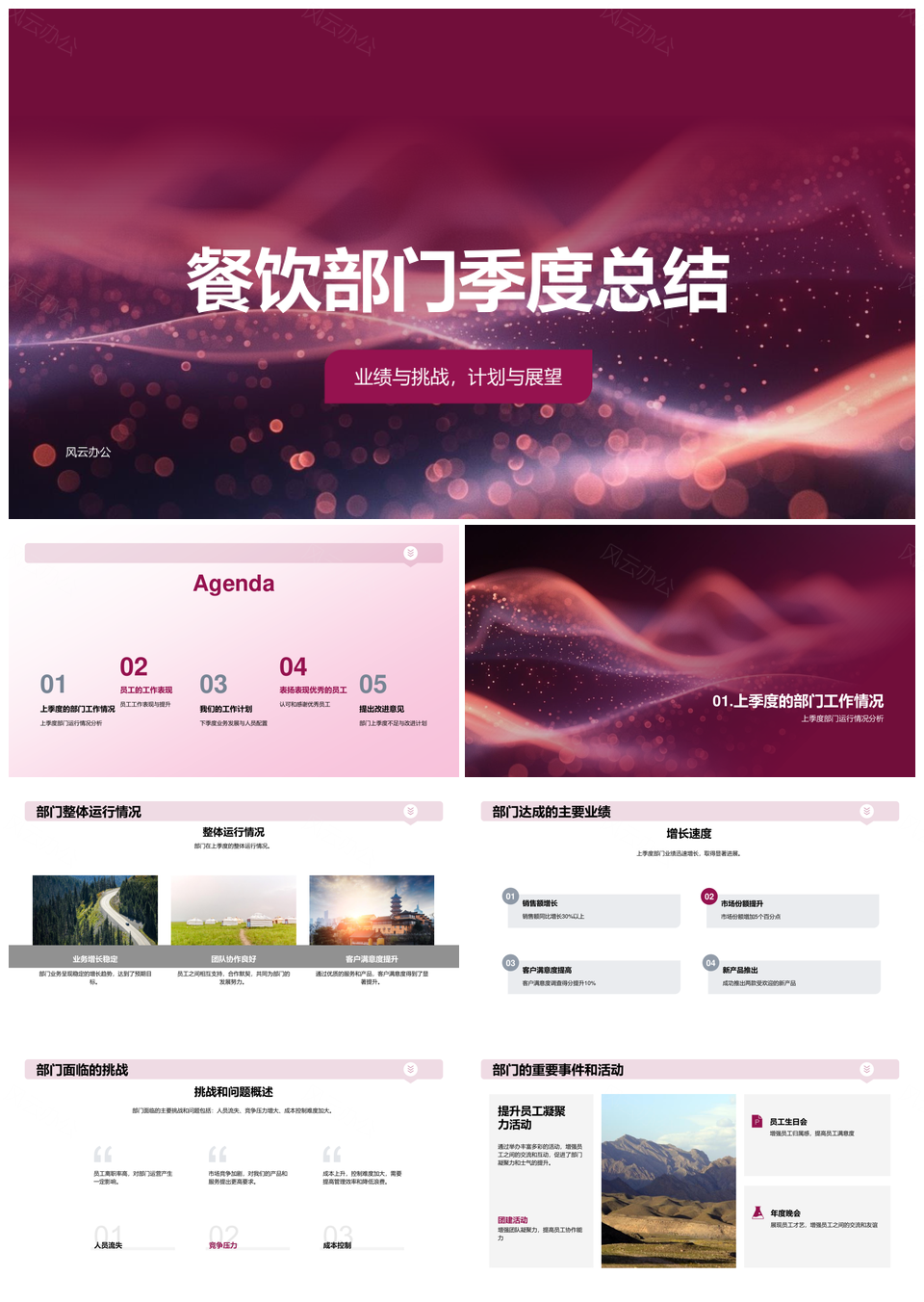 这是一张2025餐饮部门季度业绩挑战总结与计划展望PPT模板,包含2025、餐饮部门、季度业绩、挑战总结、计划展望等主题内容,也可用作2025、餐饮部门、季度业绩、挑战、总结、计划展望 2025餐饮部门季度业绩挑战、餐饮部门季度业绩挑战总结、季度业绩挑战总结计划展望、2025餐饮部门季度业绩、餐饮部门季度业绩挑战、季度业绩挑战总结、挑战总结计划展望、2025餐饮部门、餐饮部门季度业绩、季度业绩挑战、挑战总结、总结计划展望等PPT场景使用。 风云办公提供的2025餐饮部门季度业绩挑战总结与计划展望PPT模板,下载格式为pptx,一共28页,作品中文字及图均可以修改和编辑,图片更改请在作品中右键图片并更换,文字修改请直接点击文字进行修改。