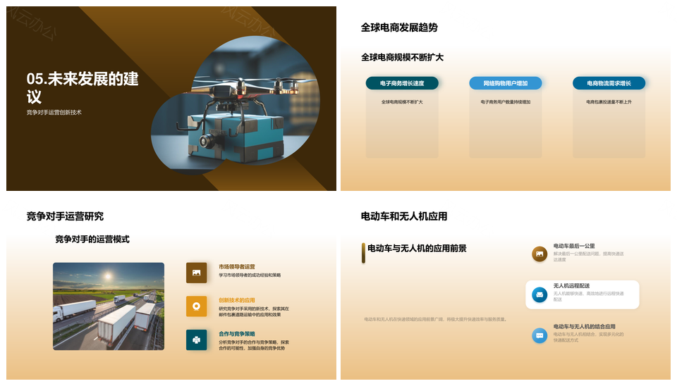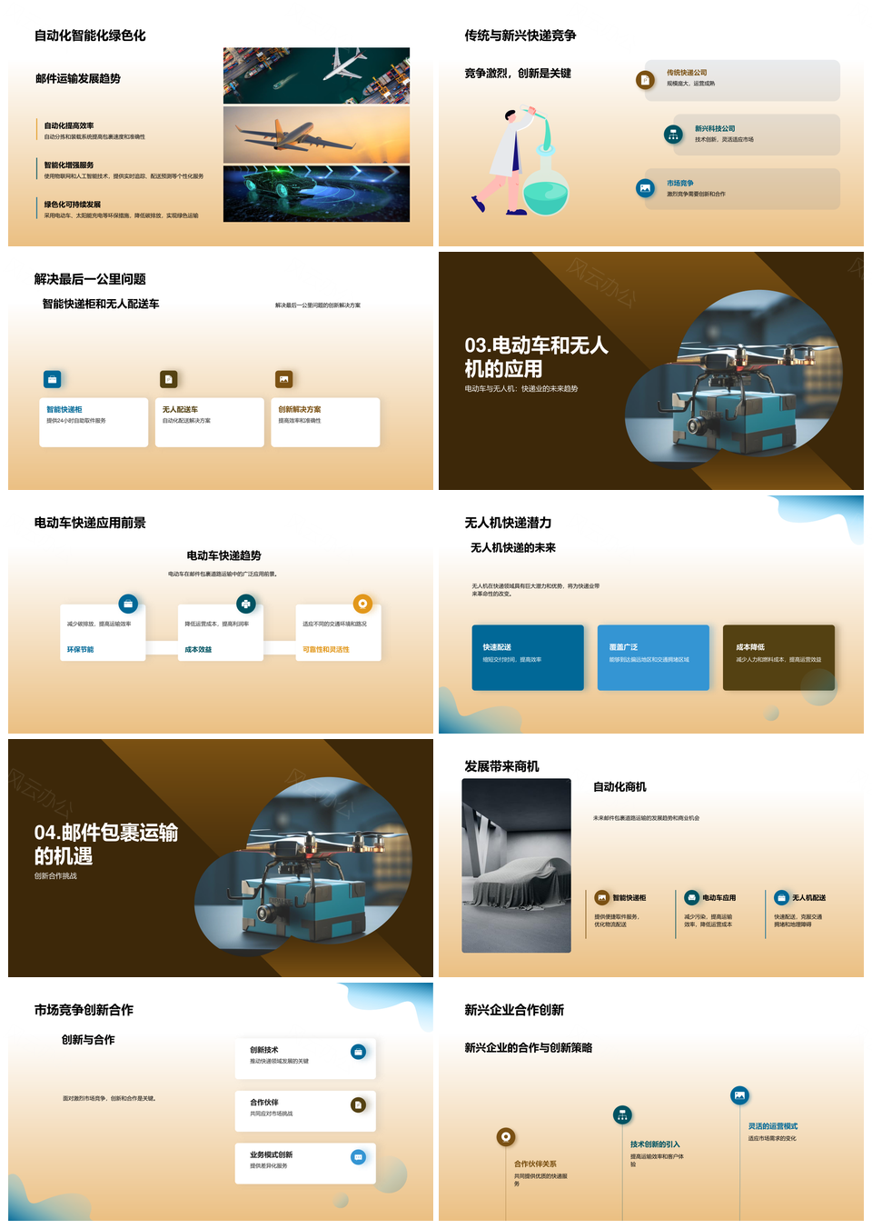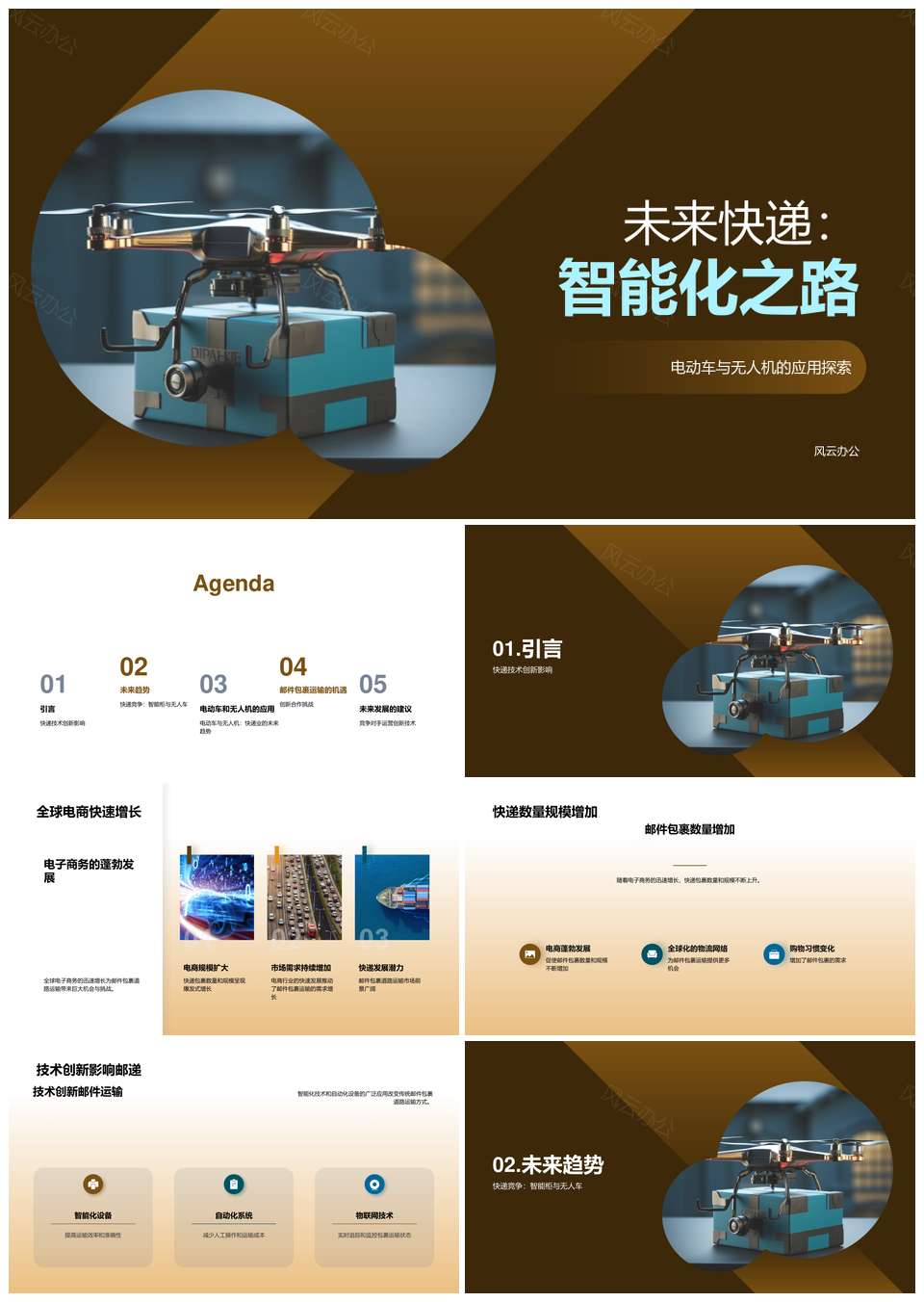 风云办公提供的未来快递无人机机遇挑战全球电商趋势PPT模板,下载格式为pptx,一共22页,作品中文字及图均可以修改和编辑,图片更改请在作品中右键图片并更换,文字修改请直接点击文字进行修改。