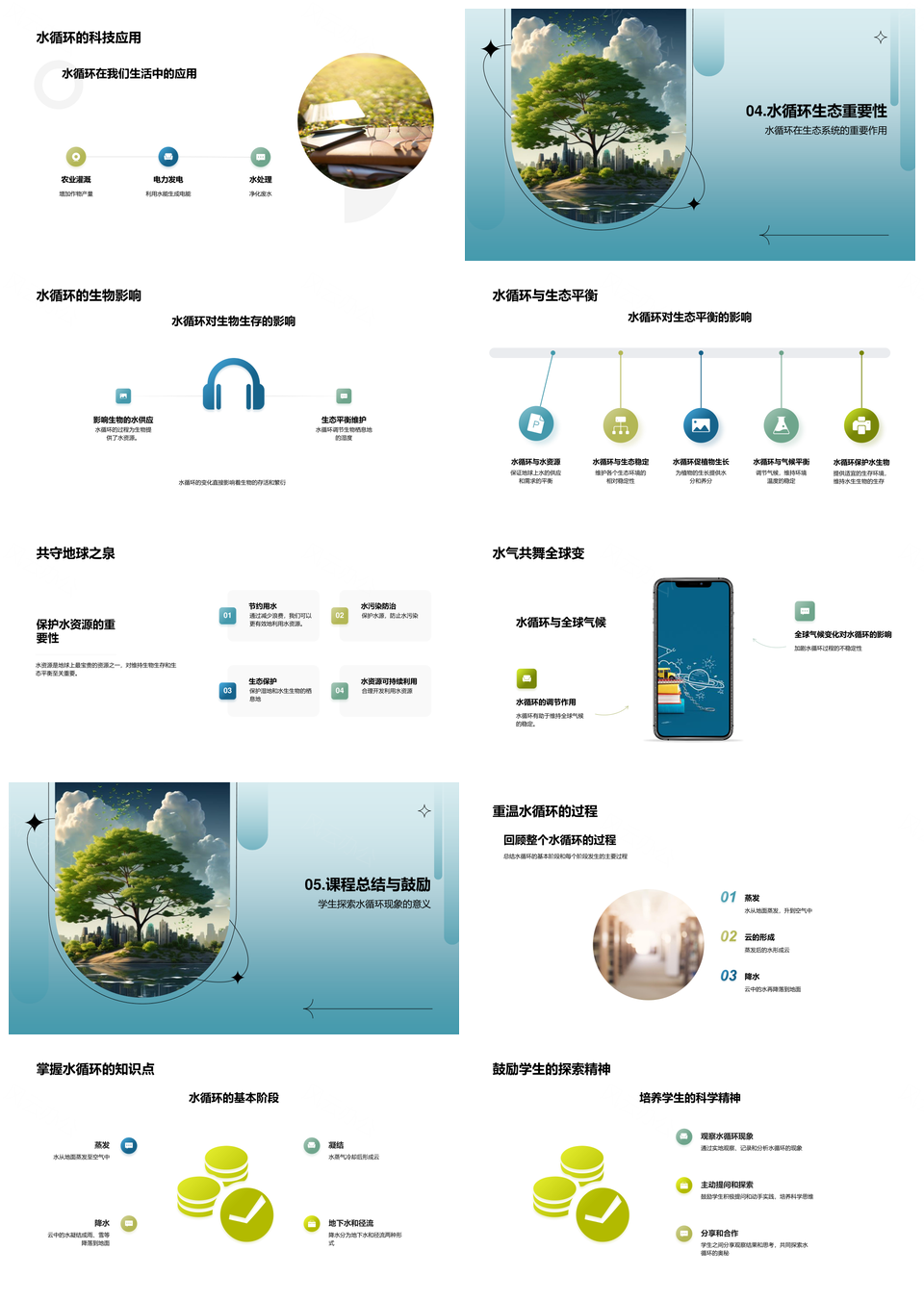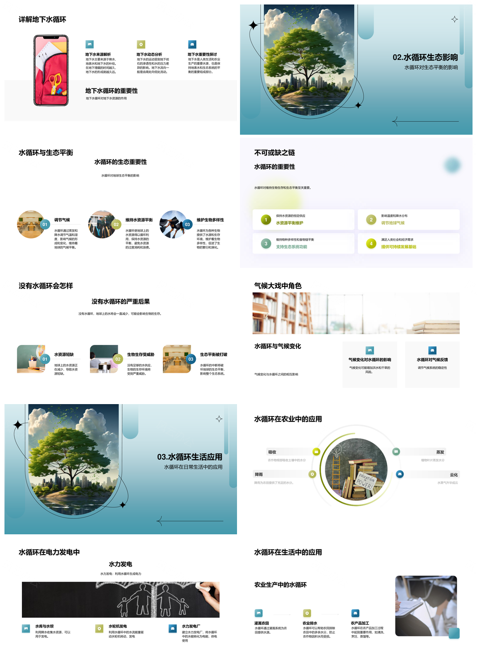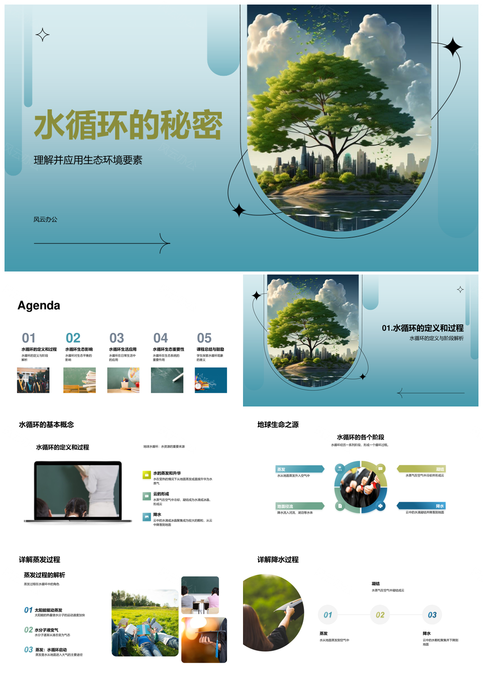 风云办公提供的水循环生态能源科学教学图解PPT模板,下载格式为pptx,一共29页,作品中文字及图均可以修改和编辑,图片更改请在作品中右键图片并更换,文字修改请直接点击文字进行修改。