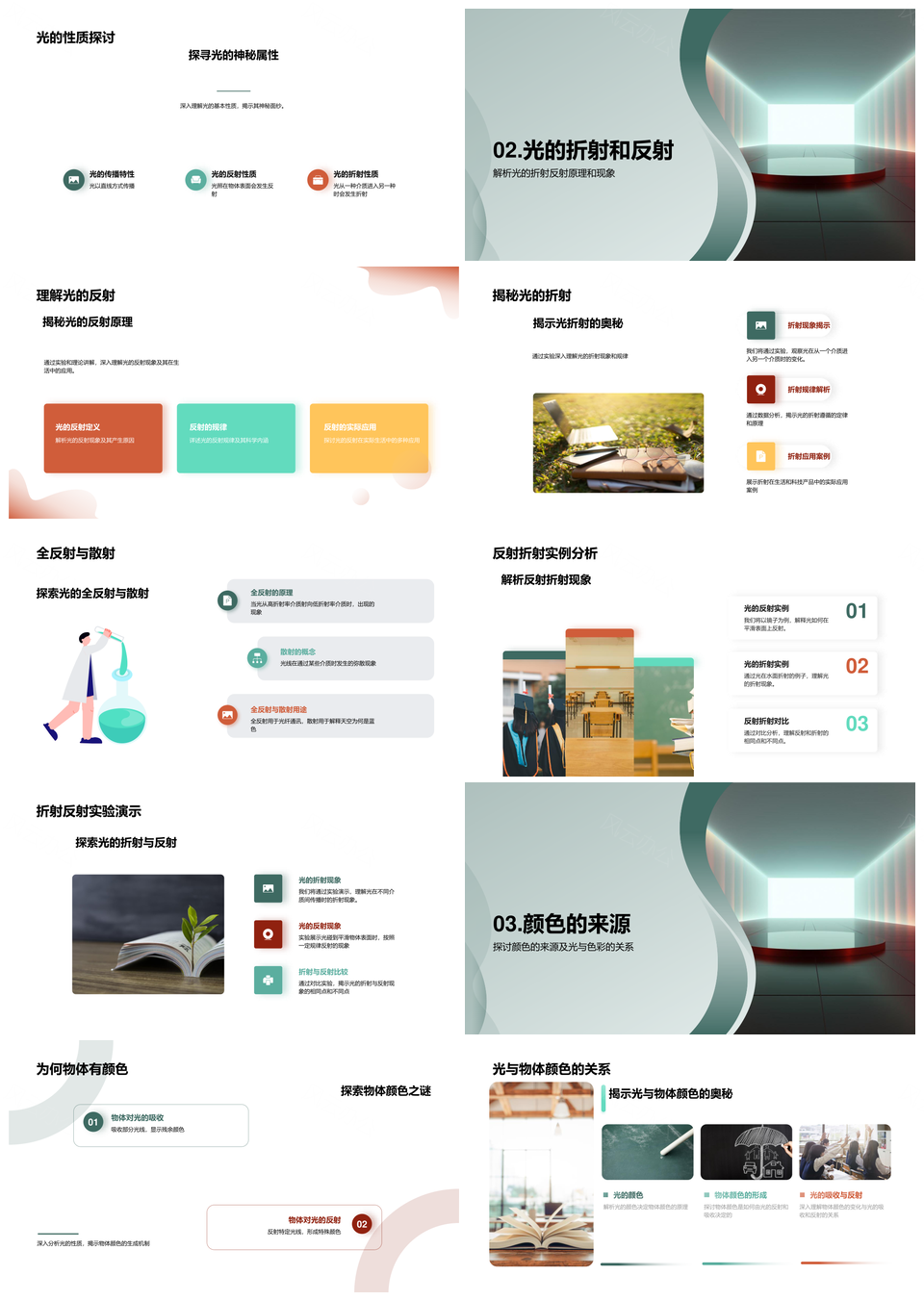 风云办公提供的初中光学实验解析反射折射与棱镜教学PPT模板,下载格式为pptx,一共33页,作品中文字及图均可以修改和编辑,图片更改请在作品中右键图片并更换,文字修改请直接点击文字进行修改。