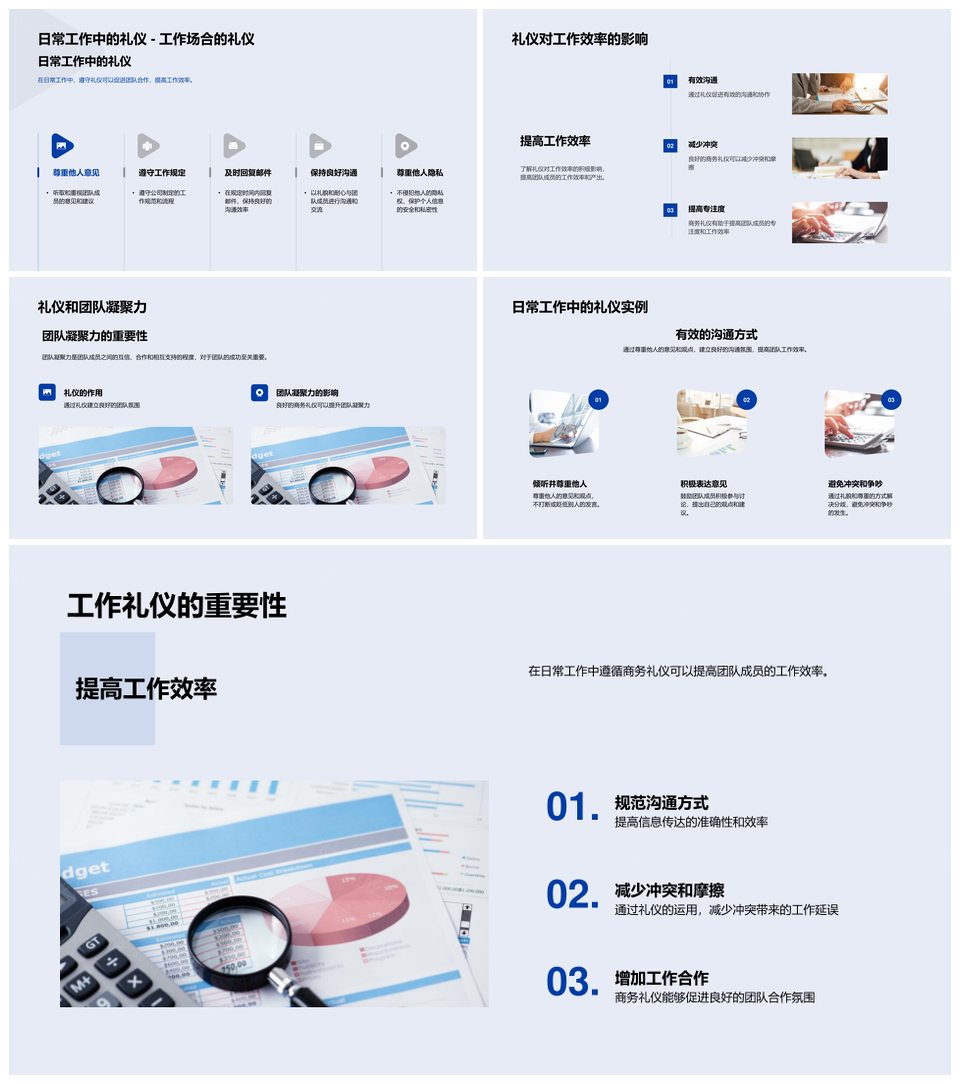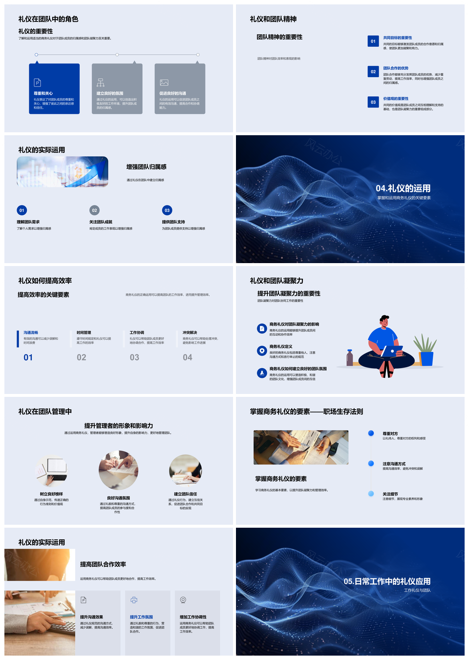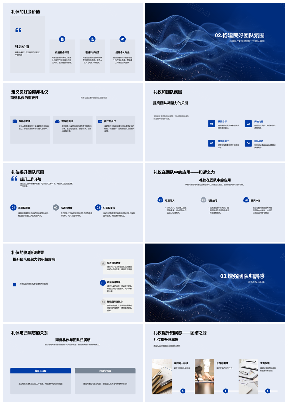 风云办公提供的商务礼仪团队凝聚力高效管理PPT模板,下载格式为pptx,一共33页,作品中文字及图均可以修改和编辑,图片更改请在作品中右键图片并更换,文字修改请直接点击文字进行修改。