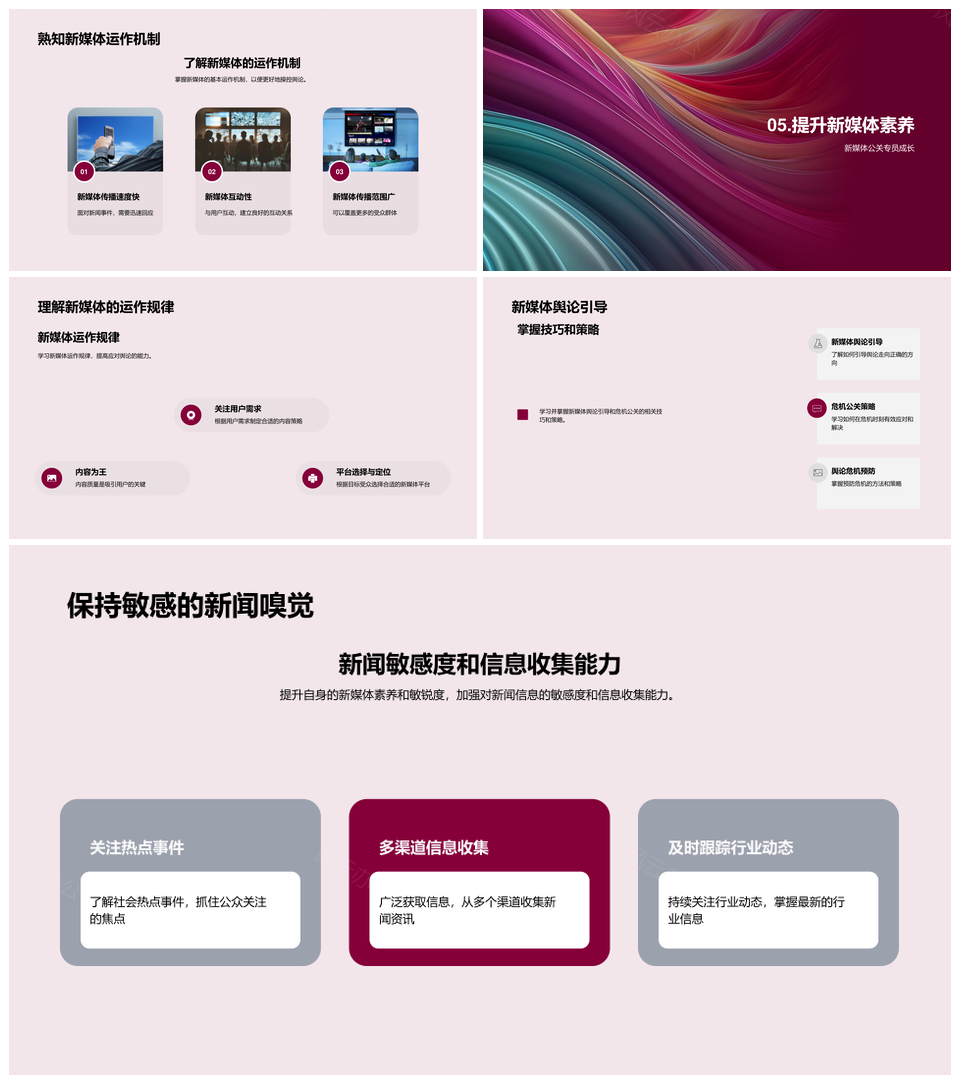 这是一张新媒体舆论引导危机公关快速响应互动表态多色几何PPT模板,包含新媒体、舆论引导、危机公关、快速响应、互动表态、多色几何等主题内容,也可用作新媒体舆论引导危机公关快速响应、舆论引导危机公关快速响应互动表态、危机公关快速响应互动表态多色、快速响应互动表态多色几何、新媒体舆论引导危机公关、舆论引导危机公关快速响应、危机公关快速响应互动表态、快速响应互动表态多色、互动表态多色几何、新媒体舆论引导、舆论引导危机公关、危机公关快速响应、快速响应互动表态、互动表态多色、多色几何等PPT场景使用。 风云办公提供的新媒体舆论引导危机公关快速响应互动表态多色几何PPT模板,下载格式为pptx,一共23页,作品中文字及图均可以修改和编辑,图片更改请在作品中右键图片并更换,文字修改请直接点击文字进行修改。