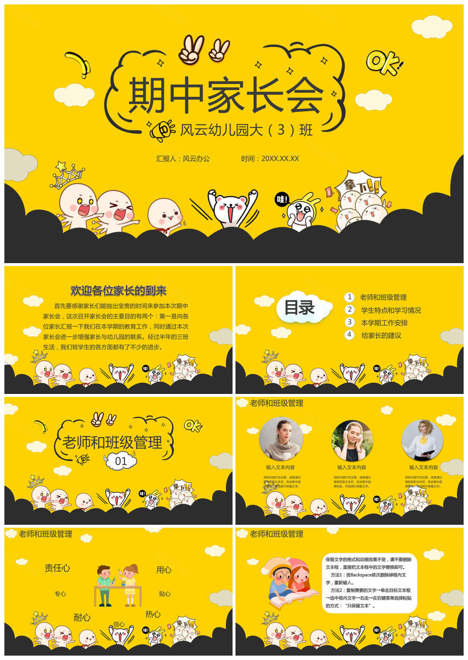 这是一张幼儿园期中家长会PPT模板,包含幼儿园、期中、家长会等主题内容,也可用作幼儿园、期中、家长会 幼儿园期中家长会、幼儿园家长会、期中家长会、幼儿园期中等PPT场景使用。 风云办公提供的幼儿园期中家长会PPT模板,下载格式为pptx,一共20页,作品中文字及图均可以修改和编辑,图片更改请在作品中右键图片并更换,文字修改请直接点击文字进行修改。