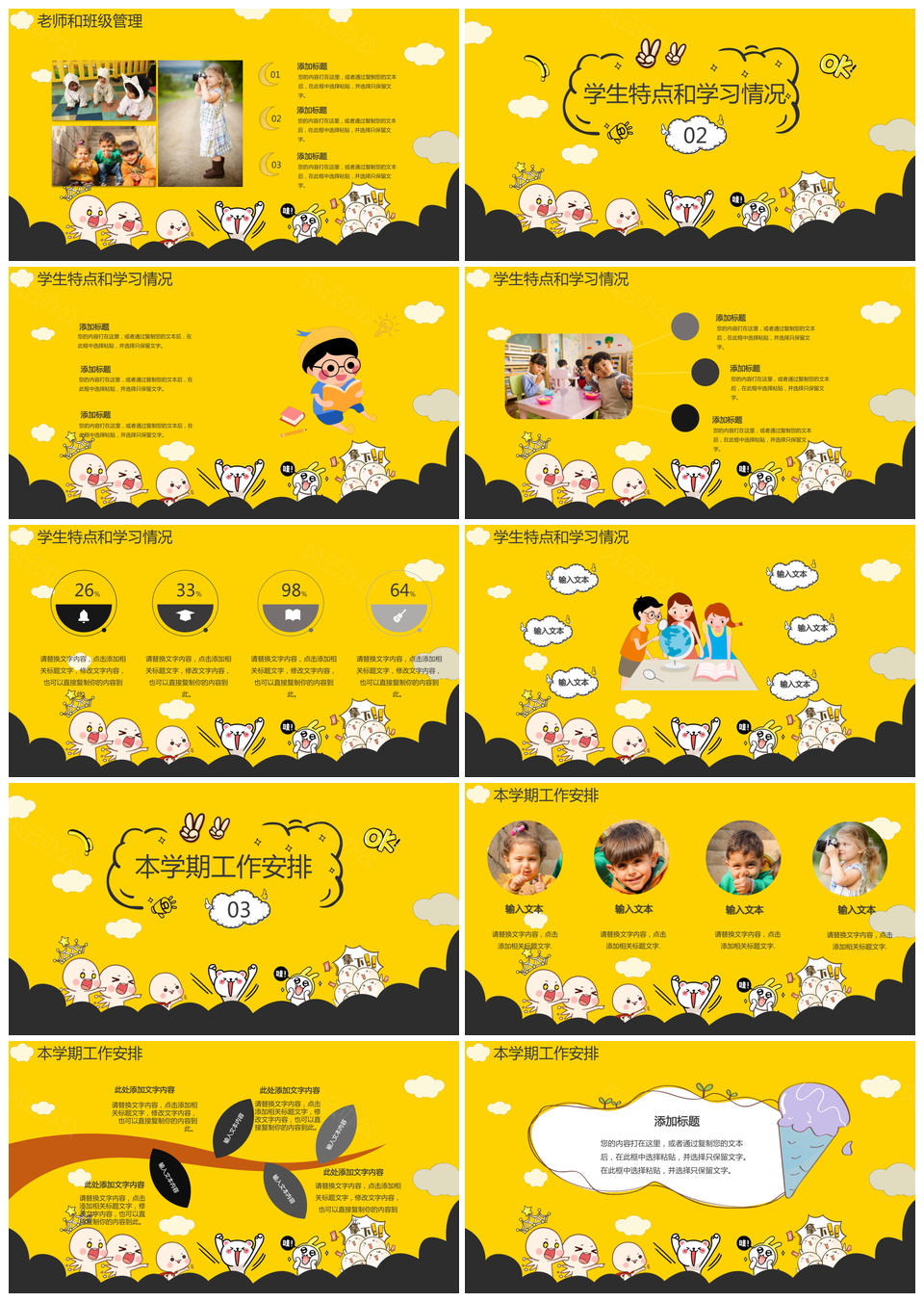 黄色手绘卡通幼儿园家长会教育培训通用PPT模板