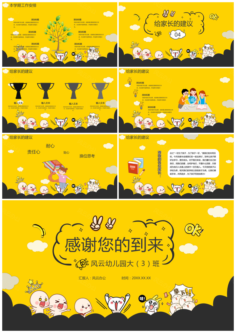黄色精美幼儿园小学中学主题家长会班会课件PPT模板