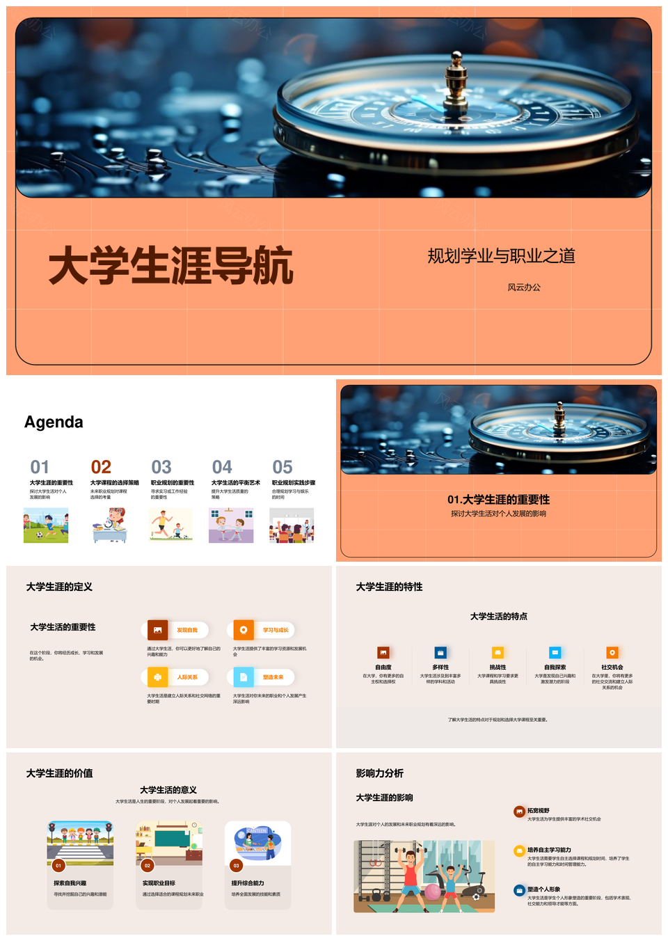 风云办公提供的大学生涯导航学业职业与生活规划PPT模板,下载格式为pptx,一共33页,作品中文字及图均可以修改和编辑,图片更改请在作品中右键图片并更换,文字修改请直接点击文字进行修改。