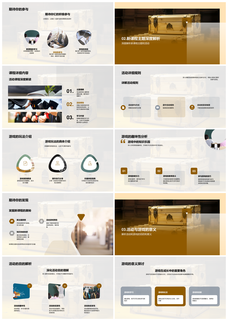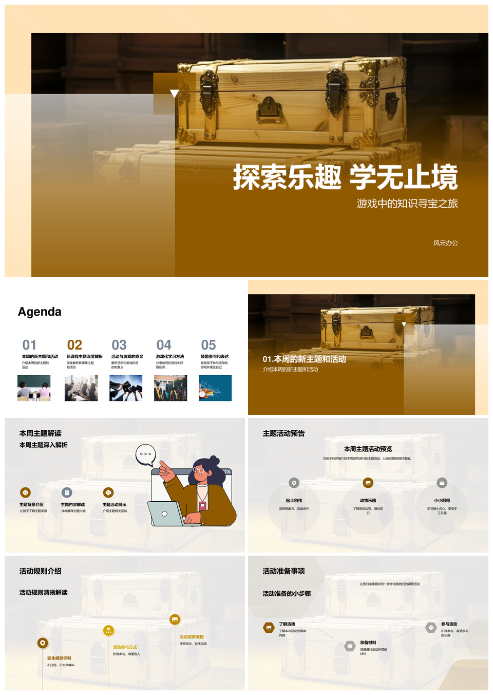 风云办公提供的幼儿园趣学探秘宝藏游戏新课程PPT模板,下载格式为pptx,一共33页,作品中文字及图均可以修改和编辑,图片更改请在作品中右键图片并更换,文字修改请直接点击文字进行修改。