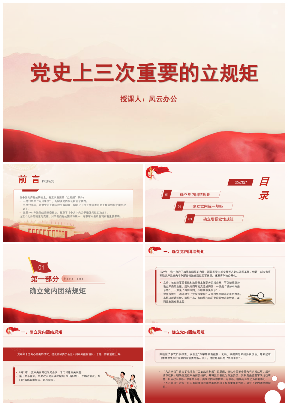 风云办公提供的党史三次重要立规矩专题党课PPT模板,下载格式为pptx,一共16页,作品中文字及图均可以修改和编辑,图片更改请在作品中右键图片并更换,文字修改请直接点击文字进行修改。