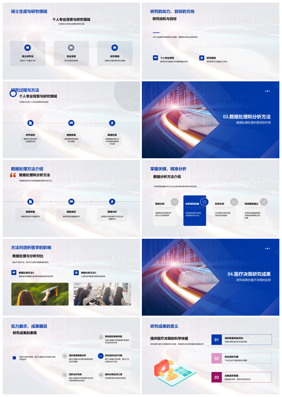 风云办公提供的医学硕士透析大数据处理决策支持研究PPT模板,下载格式为pptx,一共23页,作品中文字及图均可以修改和编辑,图片更改请在作品中右键图片并更换,文字修改请直接点击文字进行修改。