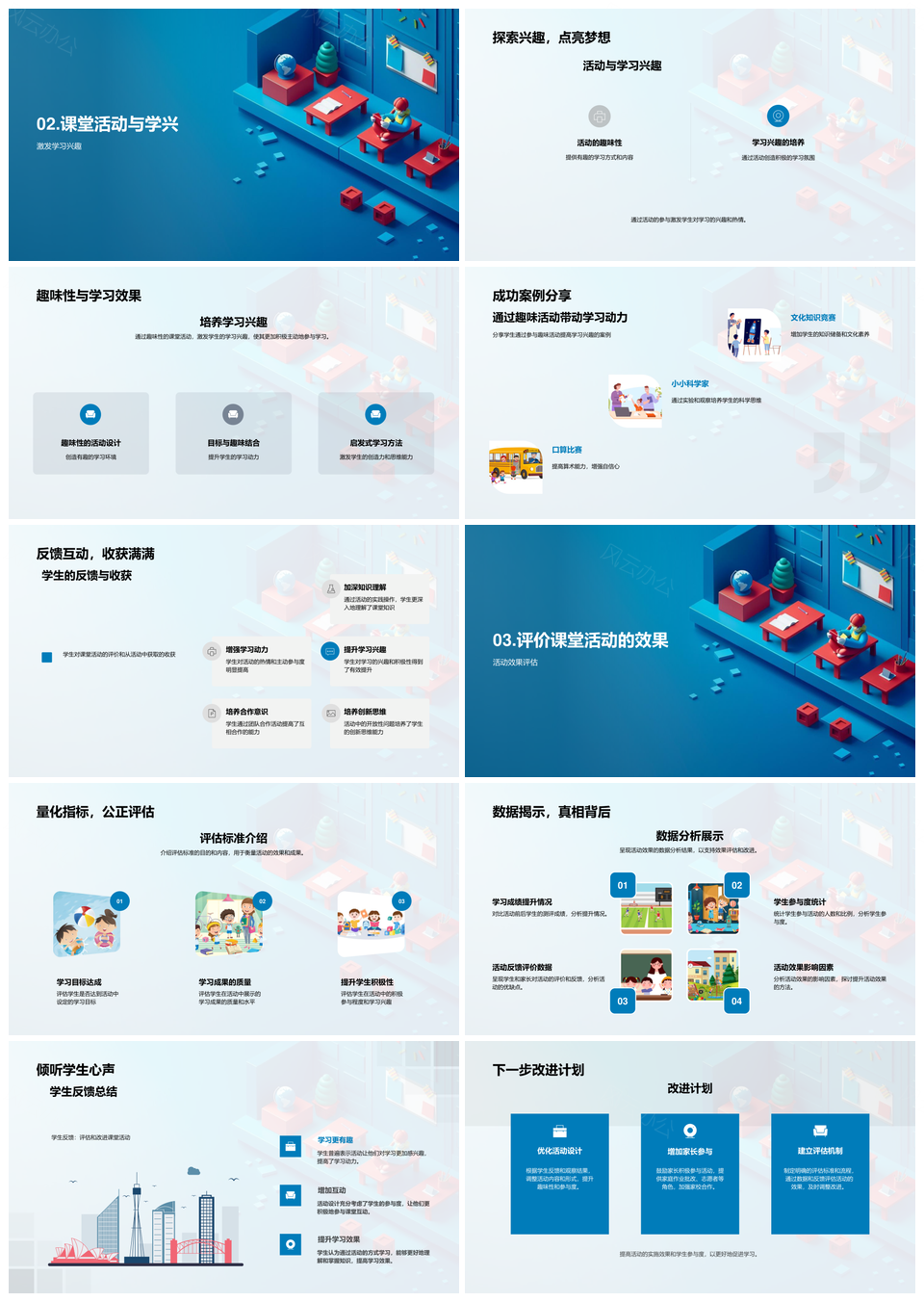 这是一张二年级课堂活动激发兴趣家长参与效果反馈PPT模板,包含二年级、课堂活动、激发、兴趣、家长、参与、效果、反馈等主题内容,也可用作课堂活动激发兴趣家长参与效果反馈、二年级课堂活动激发兴趣、课堂活动激发兴趣家长、活动激发兴趣家长参与、激发兴趣家长参与效果、兴趣家长参与效果反馈、家长参与效果反馈、二年级课堂活动激发、课堂活动激发兴趣、活动激发兴趣家长、激发兴趣家长参与、兴趣家长参与效果、家长参与效果反馈、二年级课堂活动、课堂活动激发、活动激发兴趣、激发兴趣家长、兴趣家长参与、家长参与效果、参与效果反馈、效果反馈、家长参与、二年级课堂、课堂活动、活动激发、激发兴趣等PPT场景使用。 风云办公提供的二年级课堂活动激发兴趣家长参与效果反馈PPT模板,下载格式为pptx,一共28页,作品中文字及图均可以修改和编辑,图片更改请在作品中右键图片并更换,文字修改请直接点击文字进行修改。