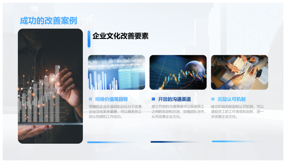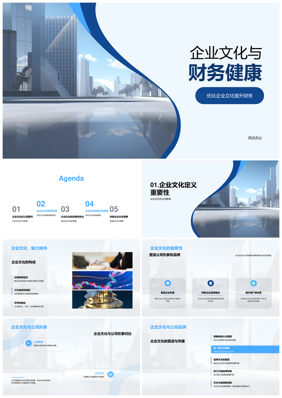 风云办公提供的企业文化优化提升品牌财务健康PPT模板,下载格式为pptx,一共29页,作品中文字及图均可以修改和编辑,图片更改请在作品中右键图片并更换,文字修改请直接点击文字进行修改。