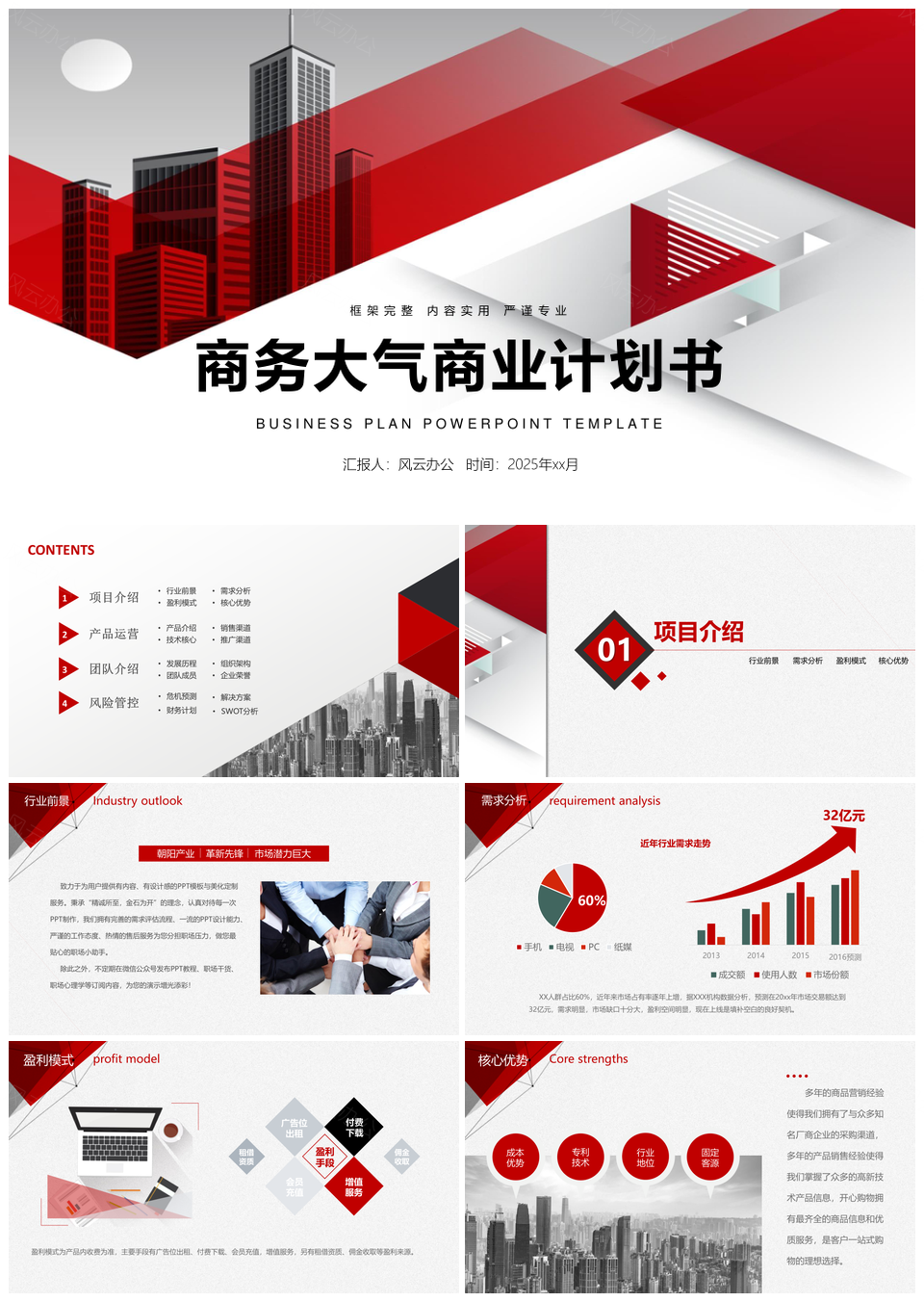 风云办公提供的2025商务大气商业计划书PPT模板,下载格式为pptx,一共23页,作品中文字及图均可以修改和编辑,图片更改请在作品中右键图片并更换,文字修改请直接点击文字进行修改。