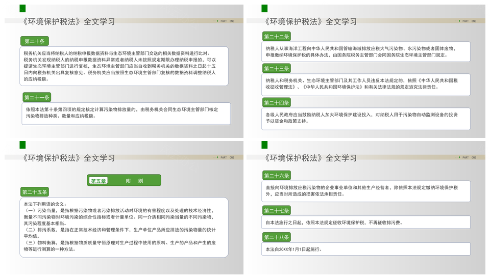 这是一张2025新修订中国环境保护税法全文解读PPT模板,包含2025、新修订、中国环境保护税法、全文、解读等主题内容,也可用作2025新修订中国环境保护税法、新修订中国环境保护税法、中国环境保护税法全文解读、2025中国环境保护税法、新修订环境保护税法全文、环境保护税法全文解读、中国环境保护税法、税法全文解读、新修订税法全文、环境保护税法全文、中国税法全文、2025环境保护税法、新修订税法、中国环境保护、税法全文等PPT场景使用。 风云办公提供的2025新修订中国环境保护税法全文解读PPT模板,下载格式为pptx,一共22页,作品中文字及图均可以修改和编辑,图片更改请在作品中右键图片并更换,文字修改请直接点击文字进行修改。