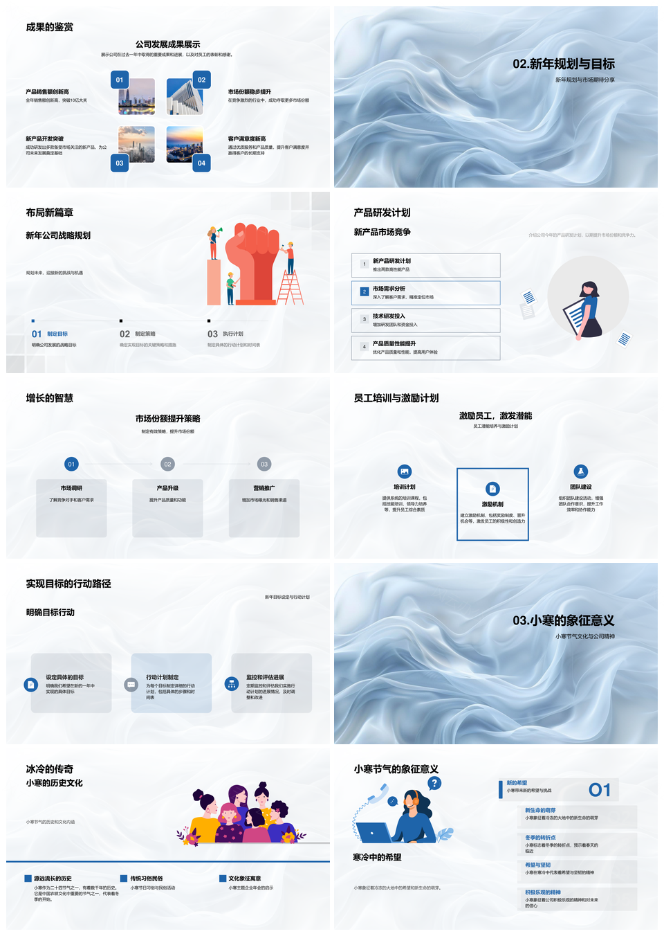 这是一张2025小寒企业年会业绩回顾新年规划研发提升份额PPT模板,包含2025、小寒、企业年会、业绩回顾、新年规划、研发、提升、份额等主题内容,也可用作2025小寒企业年会、小寒企业年会业绩、企业年会业绩回顾、年会业绩回顾新年、业绩回顾新年规划、回顾新年规划研发、新年规划研发提升、规划研发提升份额、企业年会业绩、业绩回顾新年、回顾新年规划、新年规划研发、研发提升份额、企业年会、业绩回顾、新年规划等PPT场景使用。 风云办公提供的2025小寒企业年会业绩回顾新年规划研发提升份额PPT模板,下载格式为pptx,一共33页,作品中文字及图均可以修改和编辑,图片更改请在作品中右键图片并更换,文字修改请直接点击文字进行修改。