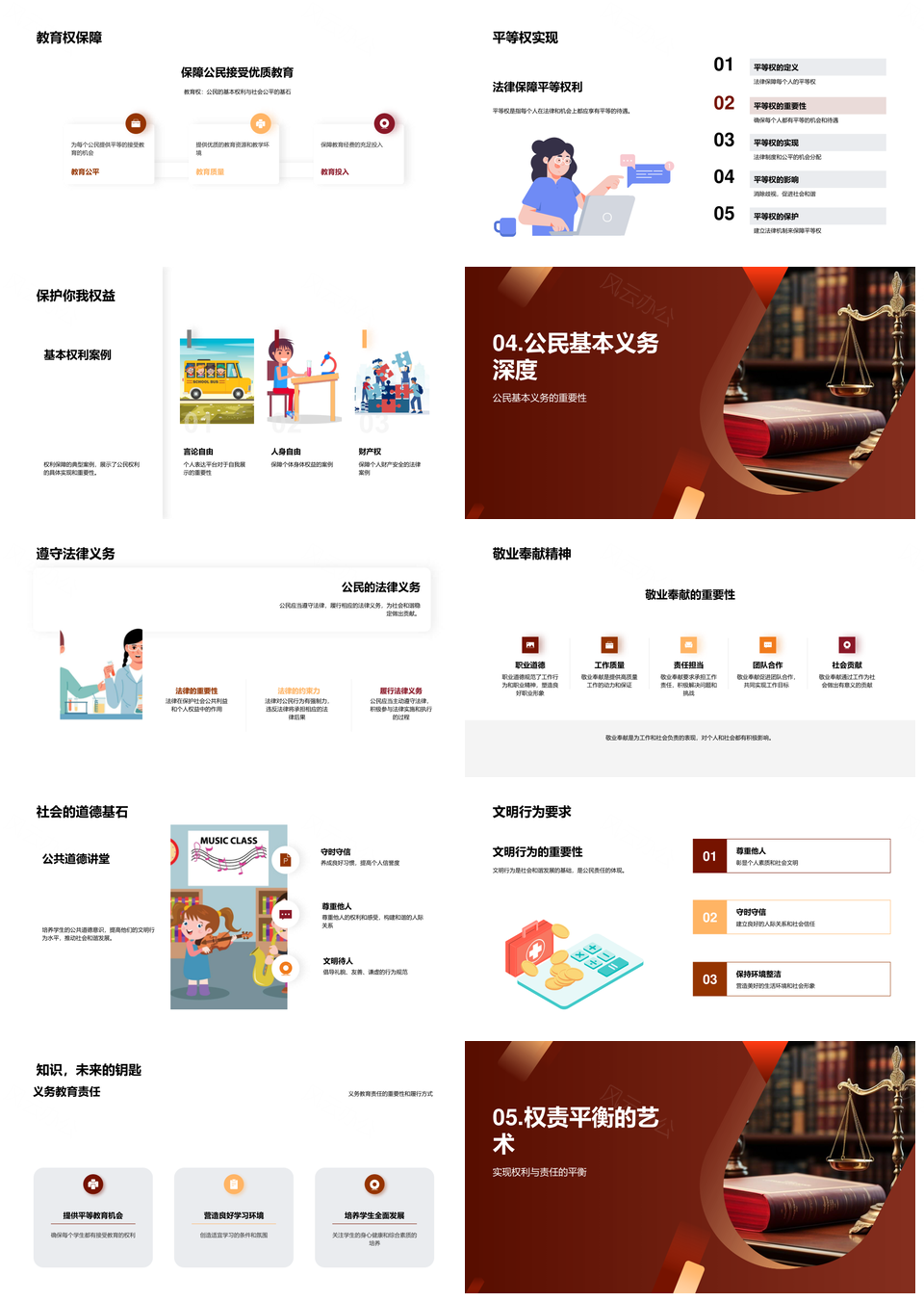 风云办公提供的公民权责法律保障教育平等守德筑和谐PPT模板,下载格式为pptx,一共33页,作品中文字及图均可以修改和编辑,图片更改请在作品中右键图片并更换,文字修改请直接点击文字进行修改。
