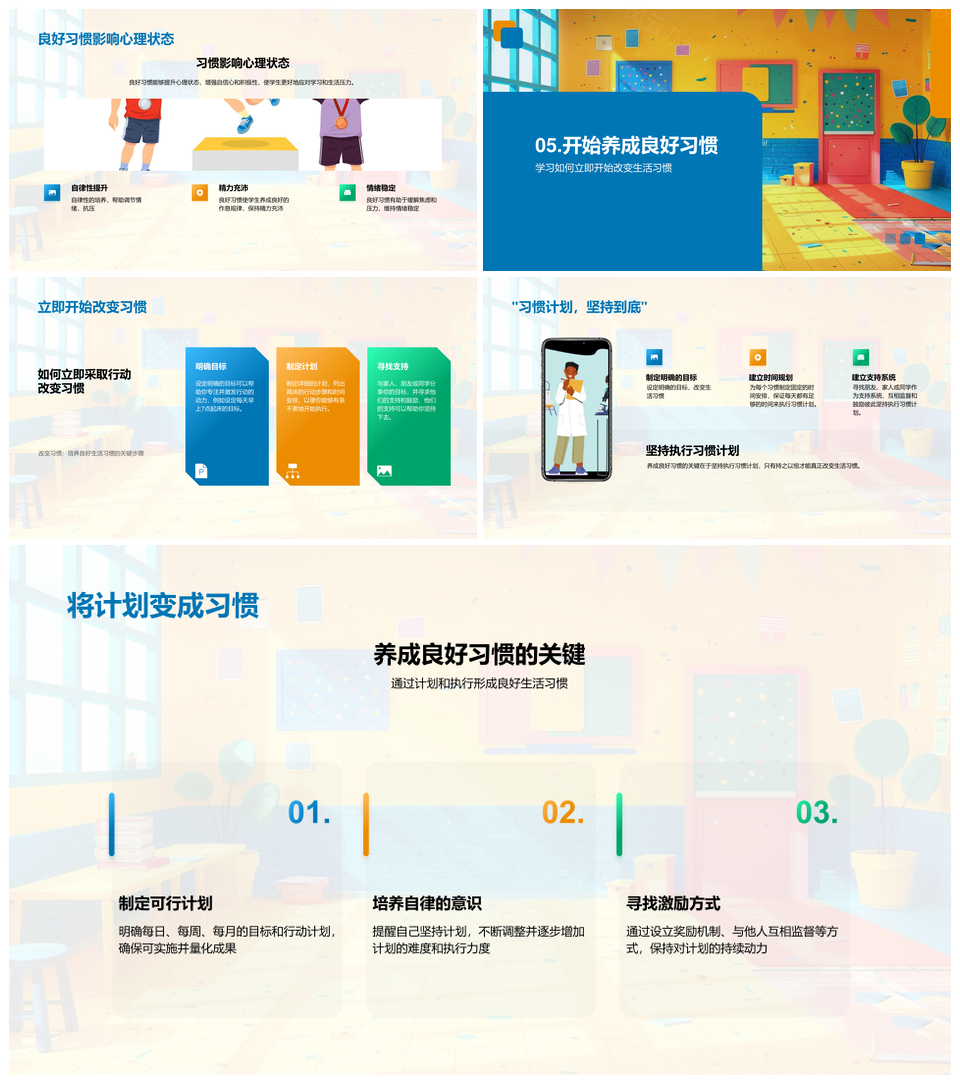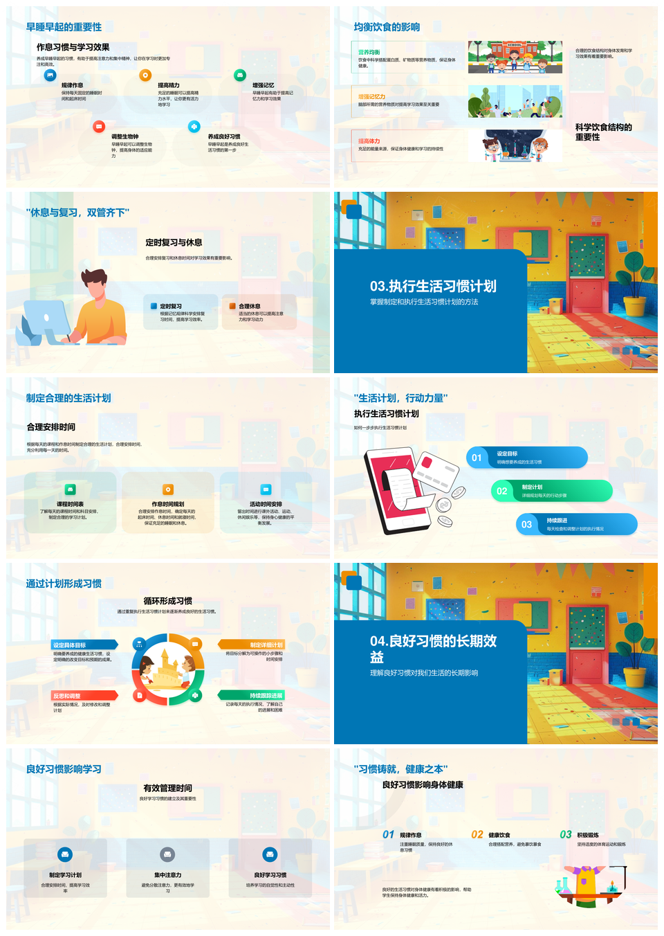 这是一张习惯计划提升成绩与心理健康作息饮食复习方案PPT模板,包含习惯、计划、提升、成绩、心理、健康、作息、饮食、复习、方案等主题内容,也可用作习惯计划提升成绩、心理健康作息饮食复习、作息饮食复习方案、习惯计划心理健康、心理健康作息饮食、提升成绩复习方案、饮食复习方案、作息饮食复习、习惯计划饮食复习、心理健康复习方案、提升成绩作息饮食、习惯计划复习方案、作息饮食心理健康、作息饮食方案、心理健康作息等PPT场景使用。 风云办公提供的习惯计划提升成绩与心理健康作息饮食复习方案PPT模板,下载格式为pptx,一共23页,作品中文字及图均可以修改和编辑,图片更改请在作品中右键图片并更换,文字修改请直接点击文字进行修改。