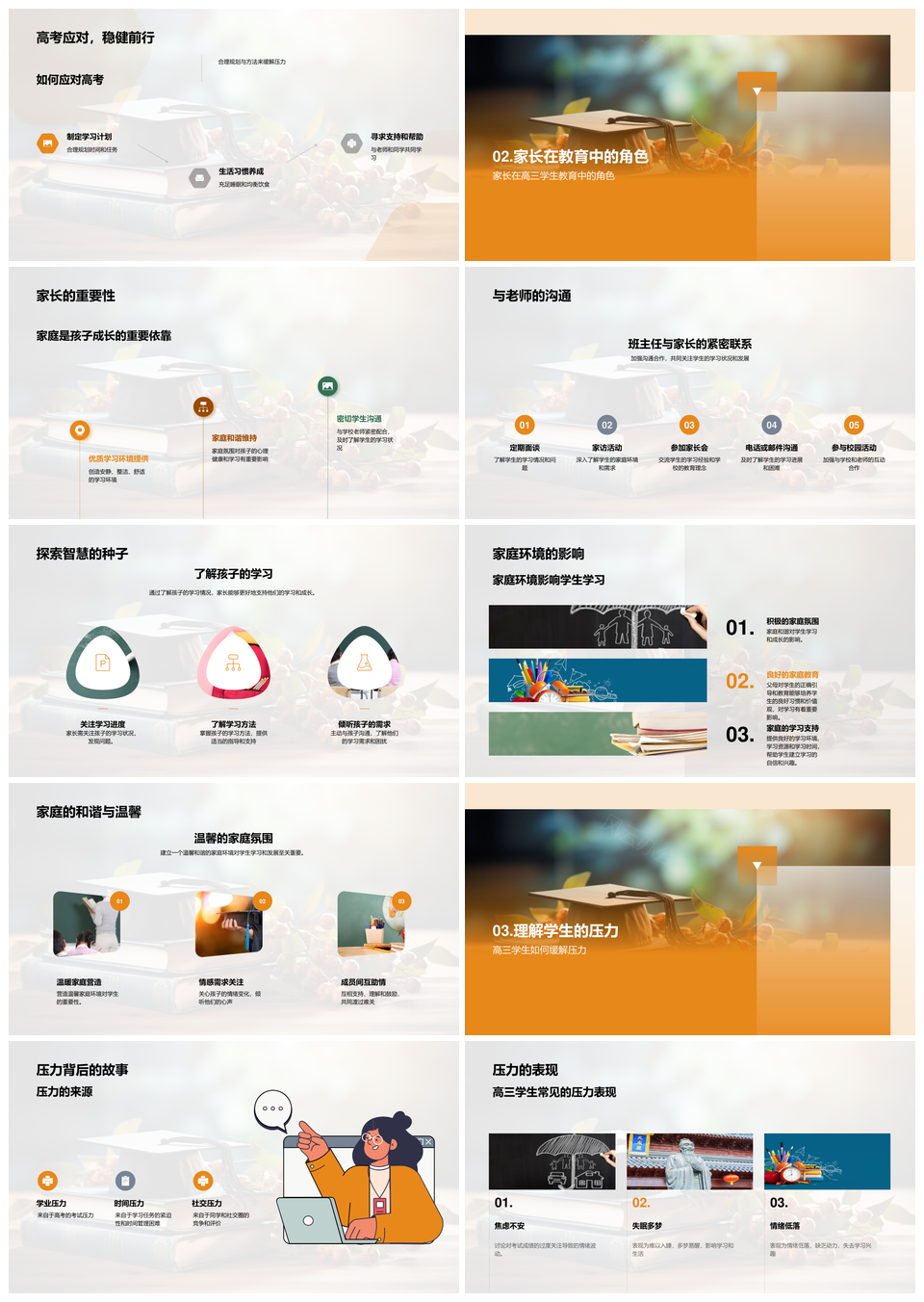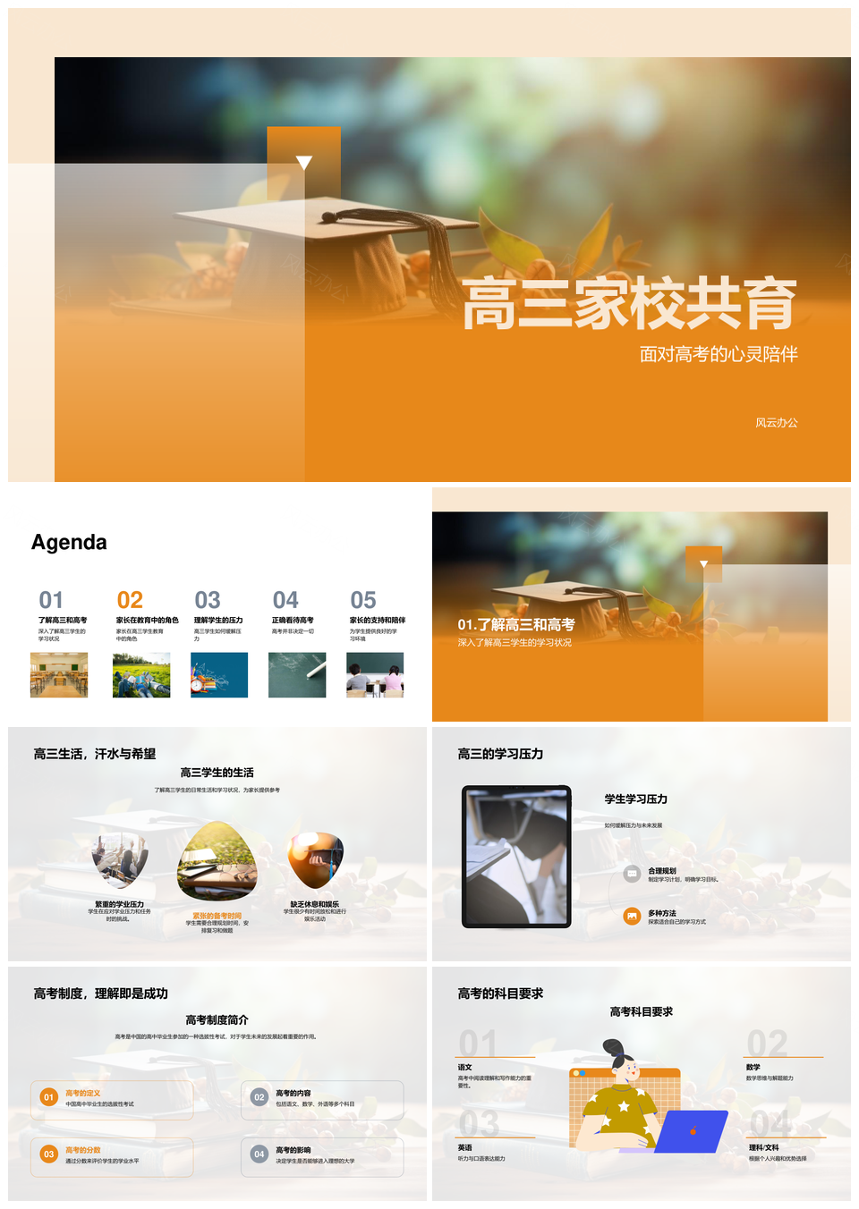 风云办公提供的高三家校共育伴考减压护和谐PPT模板,下载格式为pptx,一共33页,作品中文字及图均可以修改和编辑,图片更改请在作品中右键图片并更换,文字修改请直接点击文字进行修改。