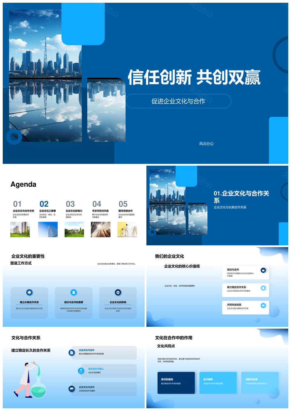 风云办公提供的信任创新共筑摩天合作共赢文化PPT模板,下载格式为pptx,一共27页,作品中文字及图均可以修改和编辑,图片更改请在作品中右键图片并更换,文字修改请直接点击文字进行修改。