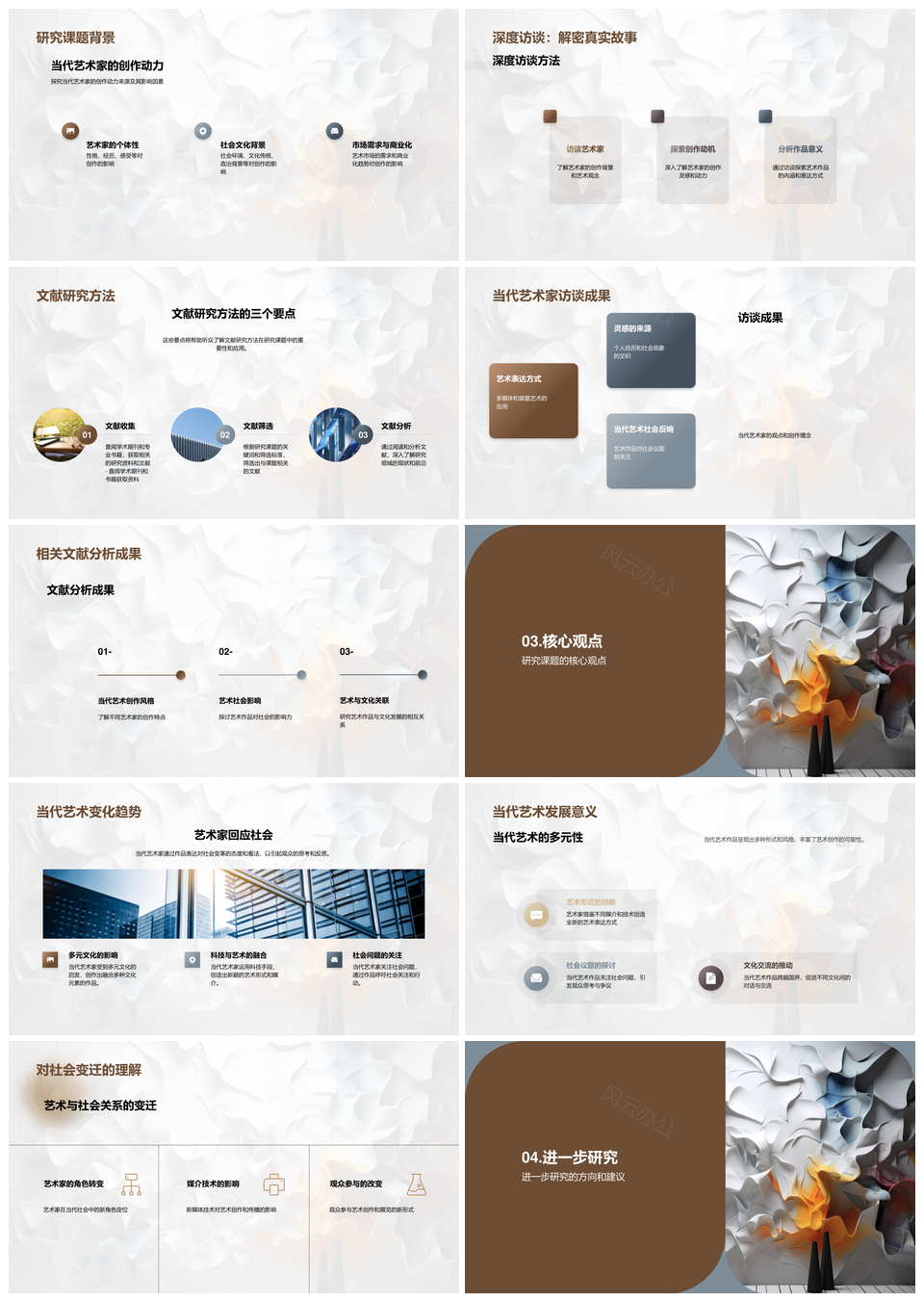 这是一张艺术学视域下当代艺术社会文化关系研究PPT模板,包含艺术学、视域、当代艺术、社会文化、关系、研究等主题内容,也可用作艺术学视域下当代艺术社会文化关系研究、艺术学视域下当代艺术社会文化、视域下当代艺术社会文化关系研究、艺术学视域下当代艺术、视域下当代艺术社会文化、当代艺术社会文化关系研究、艺术学视域下社会文化、视域下社会文化关系研究、当代艺术社会文化、艺术学视域下、视域下当代艺术、社会文化关系研究、艺术学当代艺术、艺术学社会文化、当代艺术关系研究等PPT场景使用。 风云办公提供的艺术学视域下当代艺术社会文化关系研究PPT模板,下载格式为pptx,一共21页,作品中文字及图均可以修改和编辑,图片更改请在作品中右键图片并更换,文字修改请直接点击文字进行修改。
