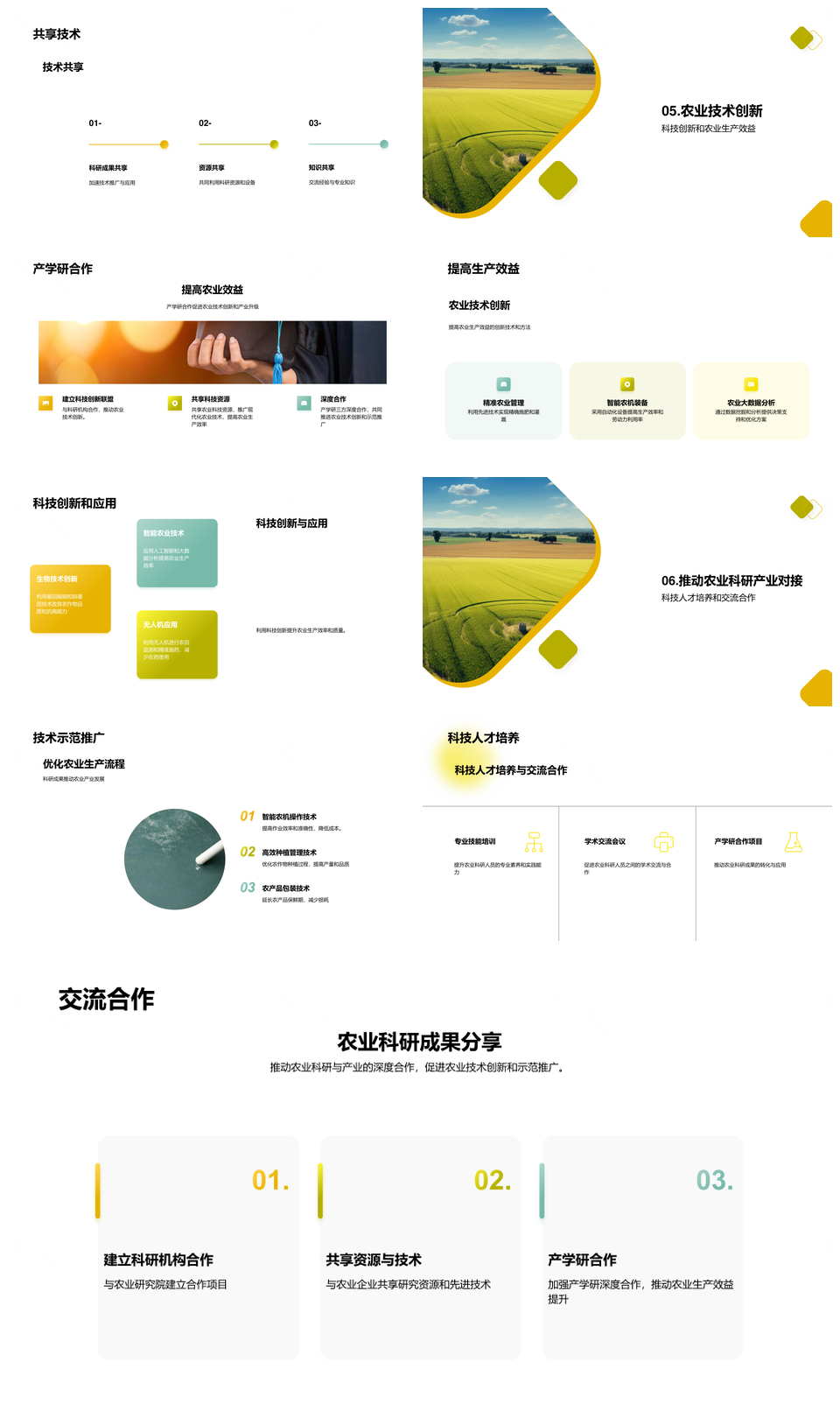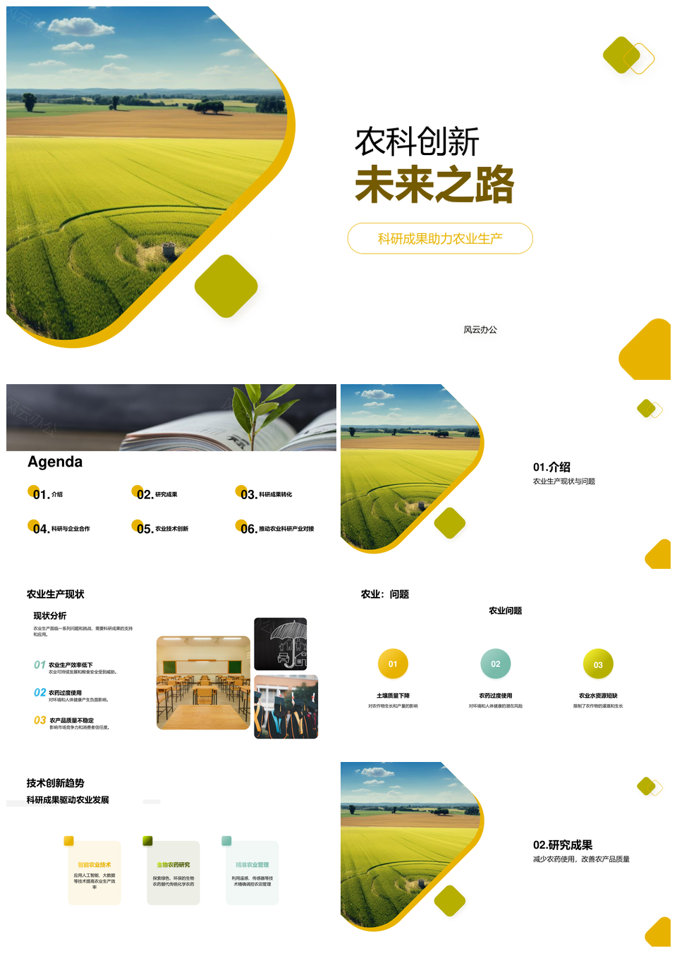 风云办公提供的农科创新成果驱动产学研发展PPT模板,下载格式为pptx,一共27页,作品中文字及图均可以修改和编辑,图片更改请在作品中右键图片并更换,文字修改请直接点击文字进行修改。
