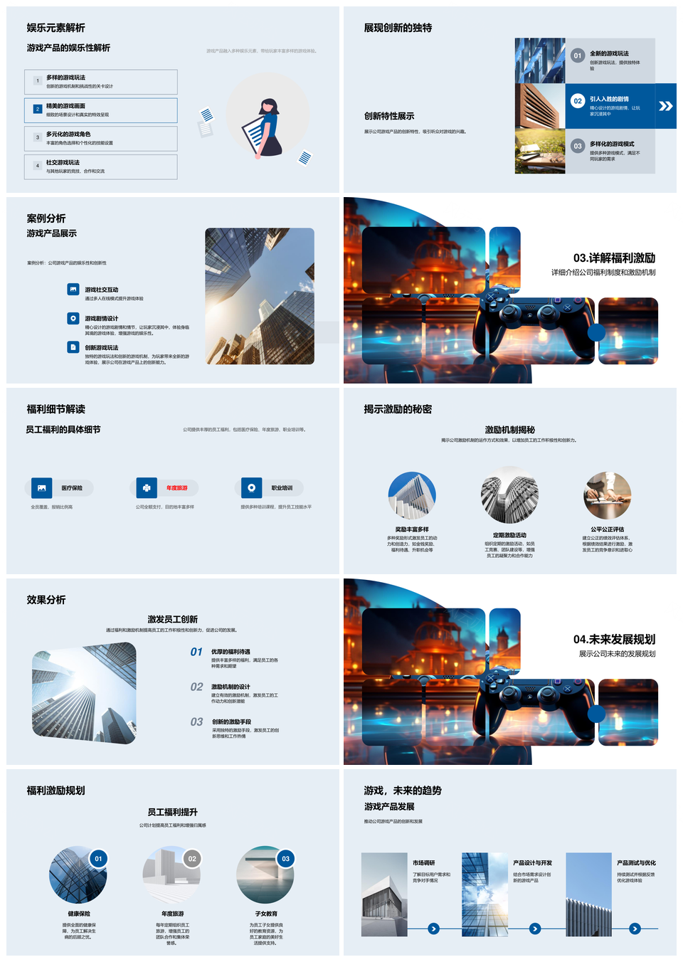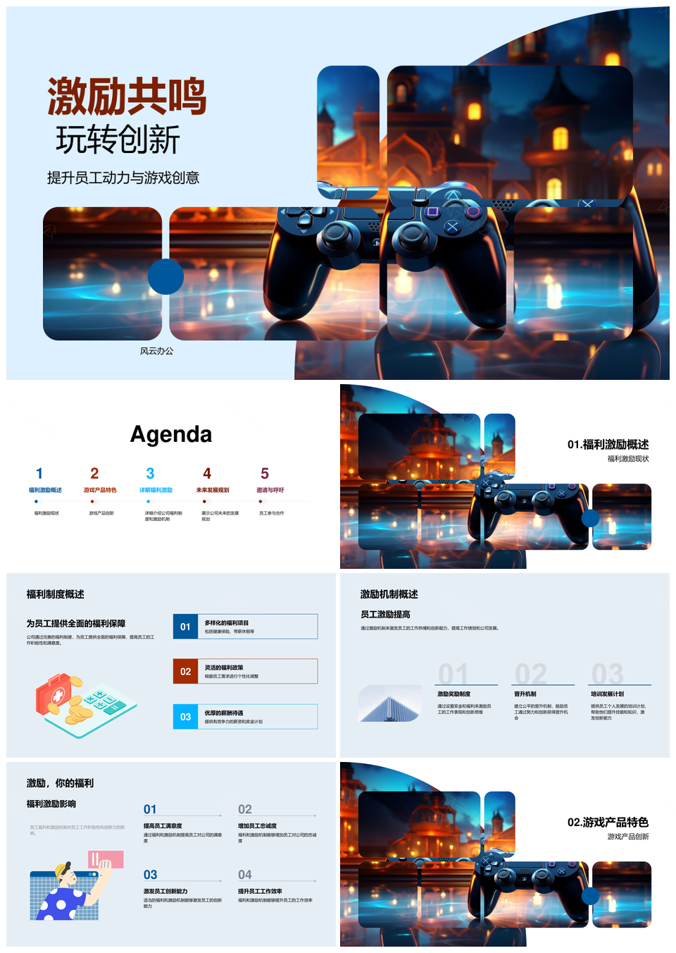 风云办公提供的游戏员工福利激励驱动创新产品开发PPT模板,下载格式为pptx,一共23页,作品中文字及图均可以修改和编辑,图片更改请在作品中右键图片并更换,文字修改请直接点击文字进行修改。