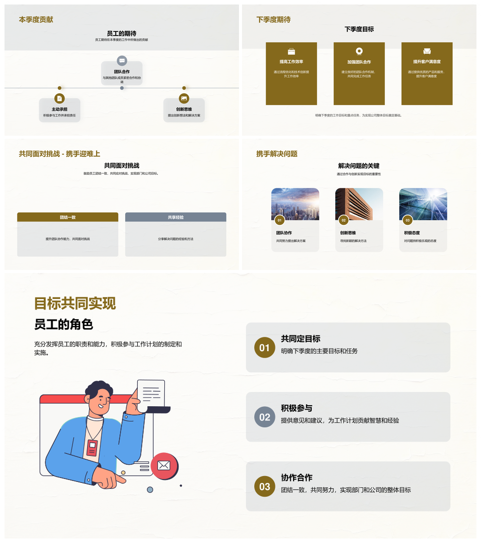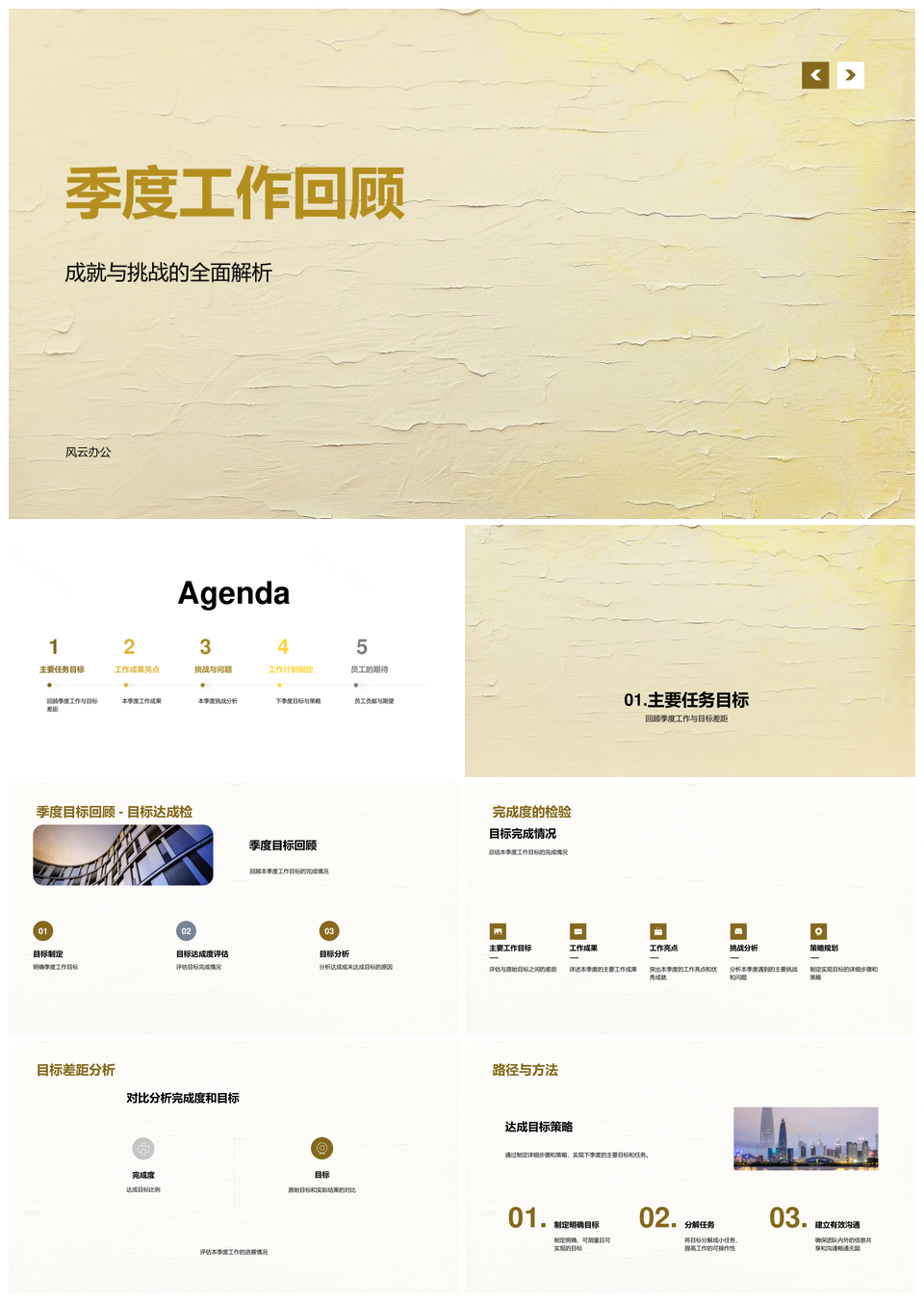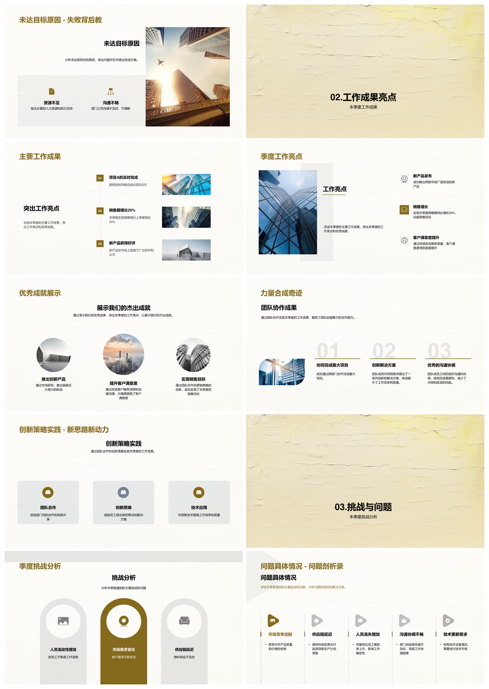 这是一张季度工作回顾成就挑战析差距协作创新亮成果PPT模板,包含季度、工作、回顾、成就、挑战、差距、协作、创新、亮、成果等主题内容,也可用作季度工作回顾成就、工作回顾成就挑战、回顾成就挑战析差距、成就挑战析差距协作、挑战析差距协作创新、析差距协作创新亮成果、季度工作回顾成就挑战、工作回顾成就挑战析差距、回顾成就挑战析差距协作、成就挑战析差距协作创新、挑战析差距协作创新亮成果、季度工作回顾成就、工作回顾成就挑战析、回顾成就挑战析差距协、成就挑战析差距协作创等PPT场景使用。 风云办公提供的季度工作回顾成就挑战析差距协作创新亮成果PPT模板,下载格式为pptx,一共33页,作品中文字及图均可以修改和编辑,图片更改请在作品中右键图片并更换,文字修改请直接点击文字进行修改。