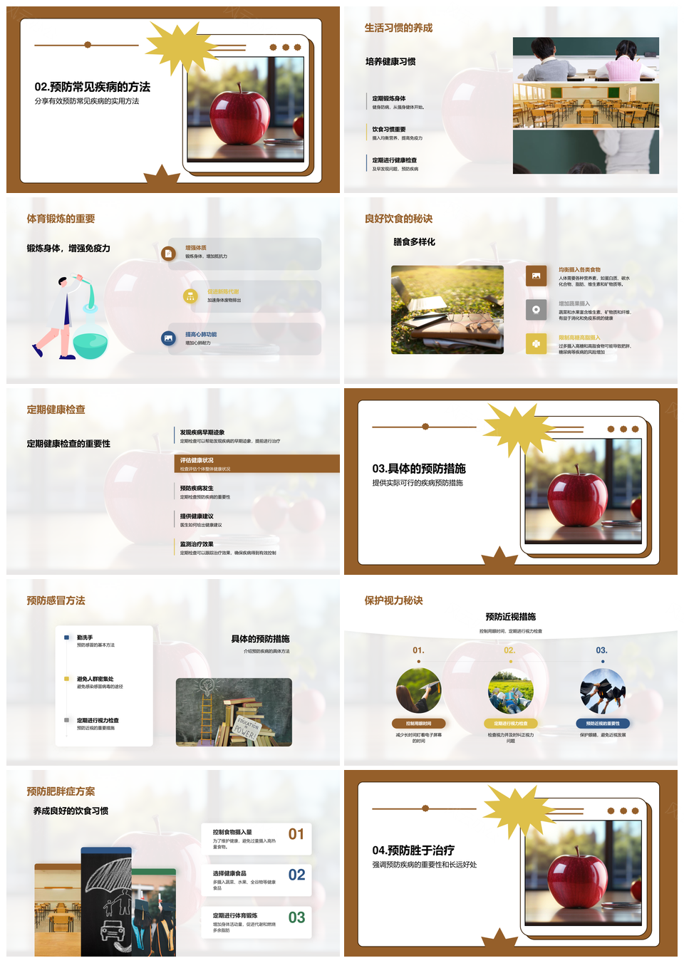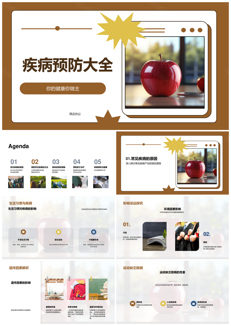 这是一张疾病预防教育生活习惯运动遗传环境苹果体检PPT模板,包含疾病预防、教育、生活习惯、运动、遗传、环境、苹果、体检等主题内容,也可用作疾病预防教育生活习惯运动、生活习惯运动遗传环境、疾病预防教育生活习惯、疾病预防生活习惯运动、教育生活习惯运动、疾病预防教育运动、疾病预防运动遗传、生活习惯运动遗传、教育运动遗传环境、运动遗传环境体检、疾病预防教育、疾病预防体检、生活习惯运动、运动遗传环境、环境苹果体检等PPT场景使用。 风云办公提供的疾病预防教育生活习惯运动遗传环境苹果体检PPT模板,下载格式为pptx,一共25页,作品中文字及图均可以修改和编辑,图片更改请在作品中右键图片并更换,文字修改请直接点击文字进行修改。
