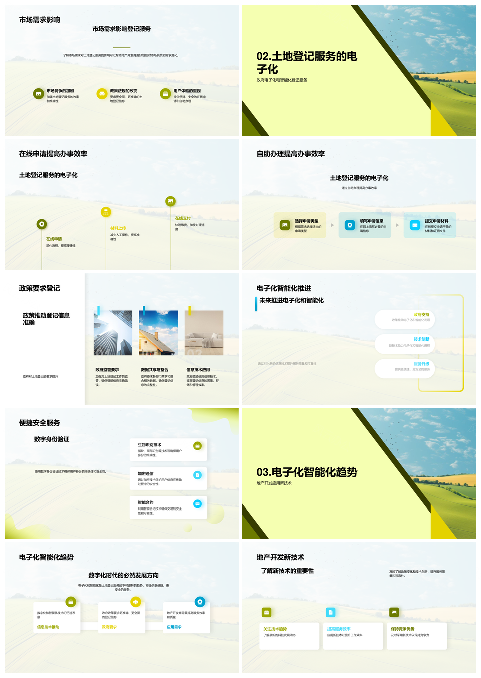 这是一张智慧土地登记电子化智能化发展趋势PPT模板,包含智慧、土地登记、电子化、智能化、发展、趋势等主题内容,也可用作智慧土地登记电子化智能化、智慧土地电子化智能化发展、土地登记电子化智能化趋势、智慧土地登记电子化发展、土地电子化智能化发展趋势、登记电子化智能化发展、智慧土地智能化发展趋势、智慧土地登记智能化、土地登记电子化趋势、电子化智能化发展趋势、智慧土地电子化、智能化发展趋势、土地登记发展、电子化趋势、智慧土地登记等PPT场景使用。