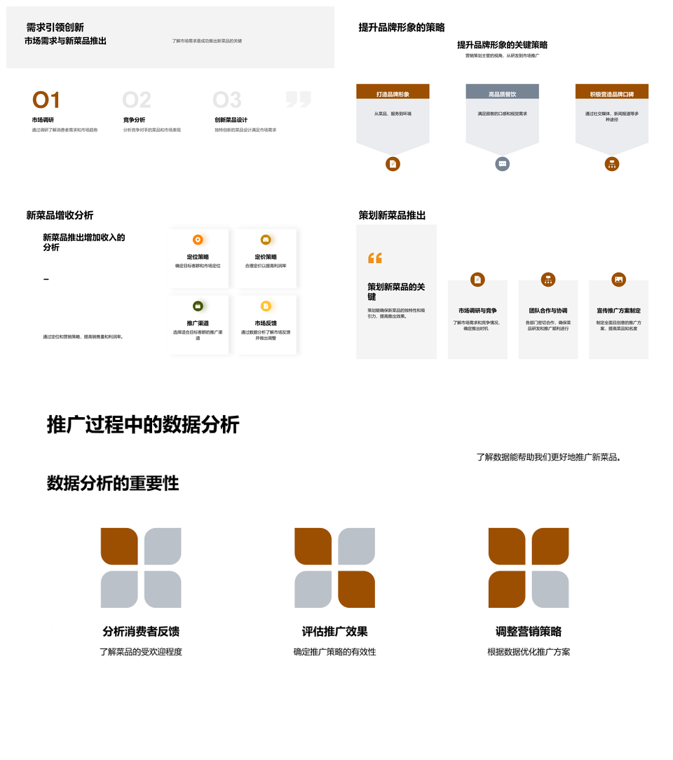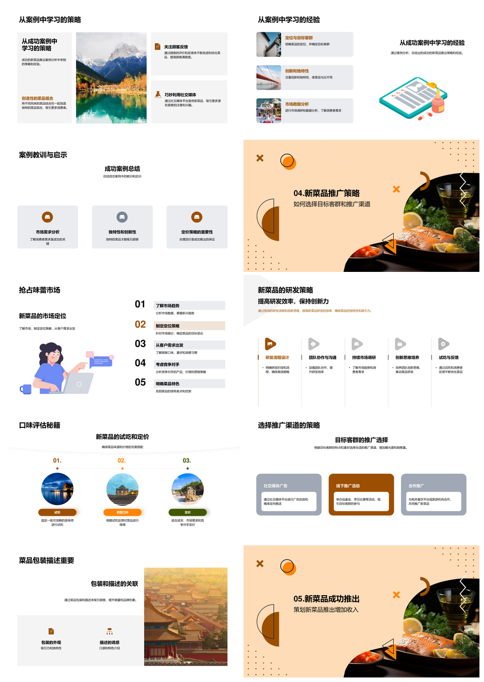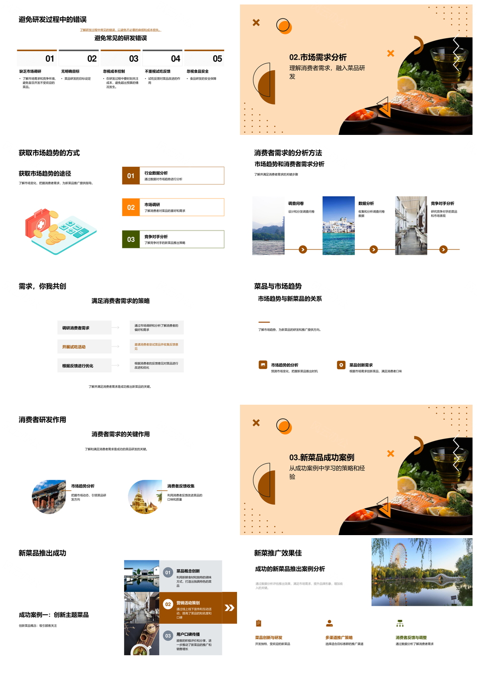 这是一张新菜品研发推广策略与市场需求趋势品牌提升PPT模板,包含新菜品、研发、推广、策略、市场、需求、趋势、品牌、提升等主题内容,也可用作新菜品研发推广策略、市场需求趋势品牌提升、新菜品研发推广、研发推广策略、推广策略市场需求、策略市场需求趋势、市场需求趋势品牌、趋势品牌提升、新菜品研发、研发推广、推广策略、策略市场需求、市场需求趋势、趋势品牌、品牌提升等PPT场景使用。 风云办公提供的新菜品研发推广策略与市场需求趋势品牌提升PPT模板,下载格式为pptx,一共33页,作品中文字及图均可以修改和编辑,图片更改请在作品中右键图片并更换,文字修改请直接点击文字进行修改。