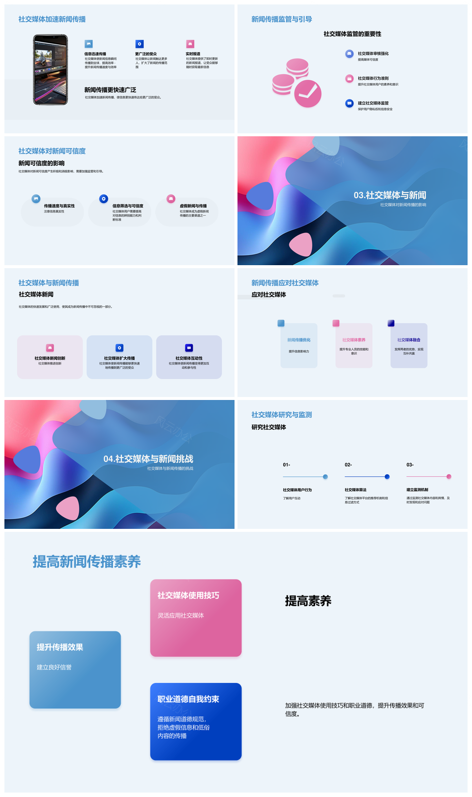 这是一张社交媒体与新闻传播PPT模板,包含社交媒体、新闻传播等主题内容,也可用作社交媒体、新闻传播 社交媒体新闻传播、新闻传播社交媒体等PPT场景使用。 风云办公提供的社交媒体与新闻传播PPT模板,下载格式为pptx,一共17页,作品中文字及图均可以修改和编辑,图片更改请在作品中右键图片并更换,文字修改请直接点击文字进行修改。
