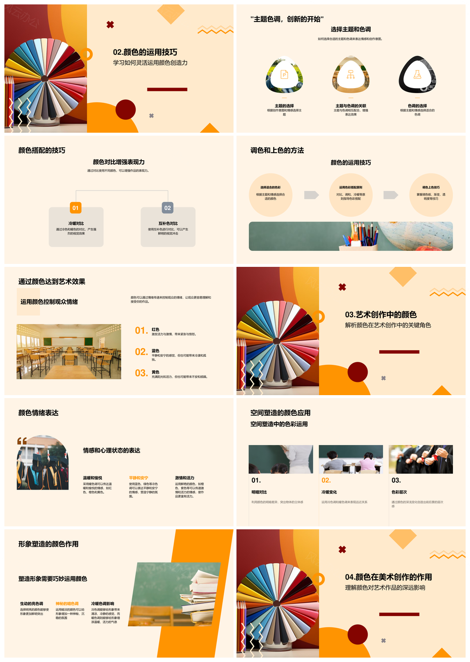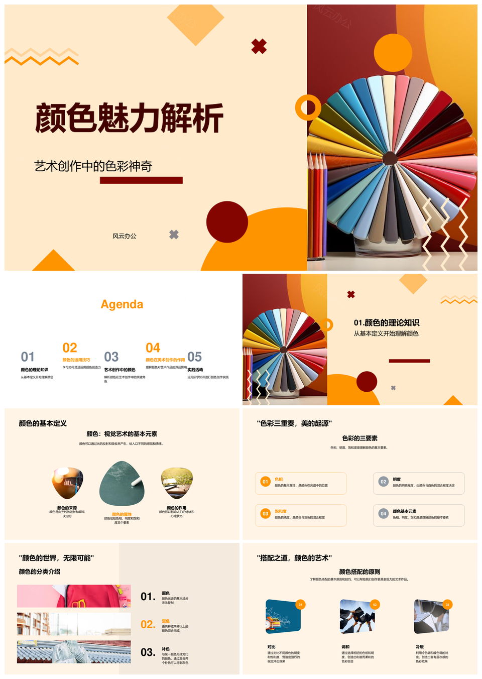 风云办公提供的艺术色彩神奇理论搭配色轮解析PPT模板,下载格式为pptx,一共23页,作品中文字及图均可以修改和编辑,图片更改请在作品中右键图片并更换,文字修改请直接点击文字进行修改。